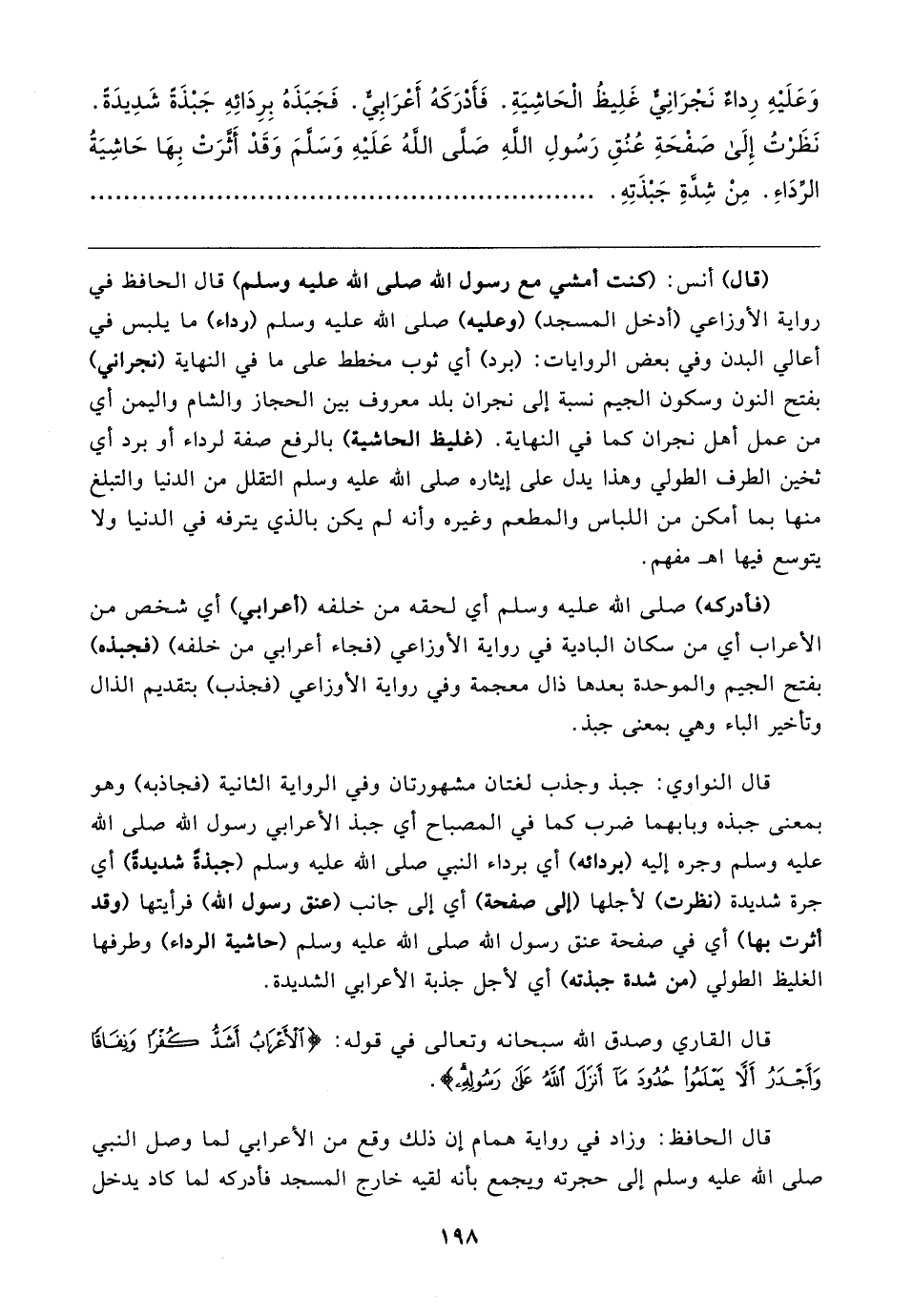 وَعَلَيهِ رِداءٌ نَجْرَانِيٌّ غَلِيظُ الْحَاشِيَةِ. فَأَدْرَكَهُ أَعْرَابِيٌّ. فَجَبَذَهُ بِرِدَالهِ جَبْذَة شَدِيدَةٌ. نَظَرْتُ إِلَى صَفْحَةِ عُنُقِ رَسُولِ اللهِ صَلَّى اللهُ عَلَيهِ وَسَلَّمَ وَقَدْ أَثَّرَتْ بِهَا حَاشِيَةُ الرِّدَاءِ. مِنْ شِدَّةِ جَبْذَتِهِ