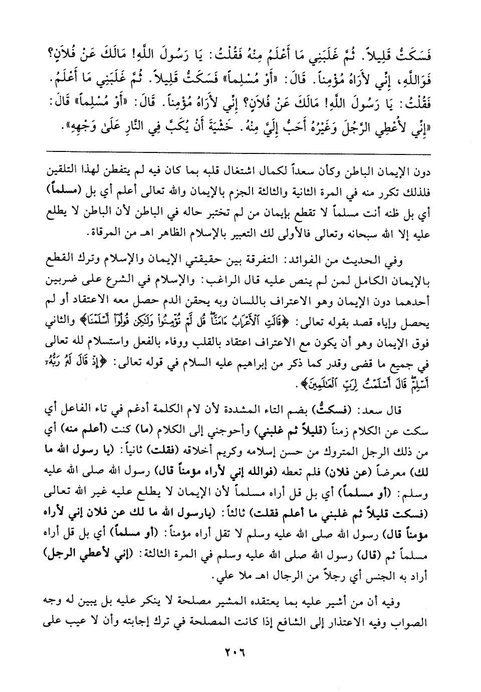 فَسَكَتُّ قَلِيلًا. ثُمَّ غَلَبَنِي مَا أَعْلَمُ مِنْهُ فَقُلْتُ: يَا رَسُولَ اللهِ! مَا لكَ عَنْ فُلانٍ؟ فَوَاللهِ، إِني لأرَاهُ مُؤْمِنًا. قَال: "أَوْ مُسْلِمًا" فَسَكَتُّ قَلِيلًا. ثُمَّ غَلَبَنِي مَا أَعْلَمُ. فَقُلْتُ: يَا رَسُولَ اللهِ! مَا لكَ عَنْ فُلانٍ؟ إِني لأرَاهُ مُؤْمِنًا. قَال: "أَوْ مُسْلِمًا" قَال: "إِني لأُعْطِي الرَّجُلَ وَغَيرُهُ أَحَبُّ إِلَيَّ مِنْهُ. خَشْيَةَ أَنْ يُكَبَّ فِي النارِ عَلَى وَجْهِهِ"