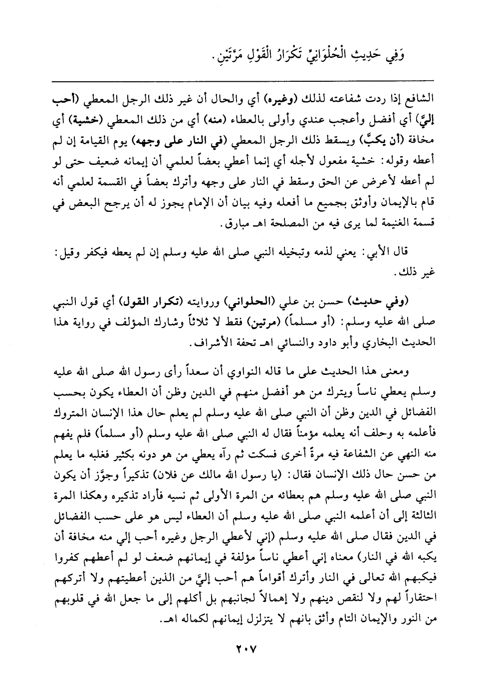 (وفي حديث) حسن بن علي (الحلواني) وروايته (تكرار القول) أي قول النبي صلى الله عليه وسلم: (أو مسلمًا) (مرتين) فقط لا ثلاثًا وشارك المؤلف في رواية هذا الحديث البخاري وأبو داود والنسائي اهـ تحفة الأشراف.