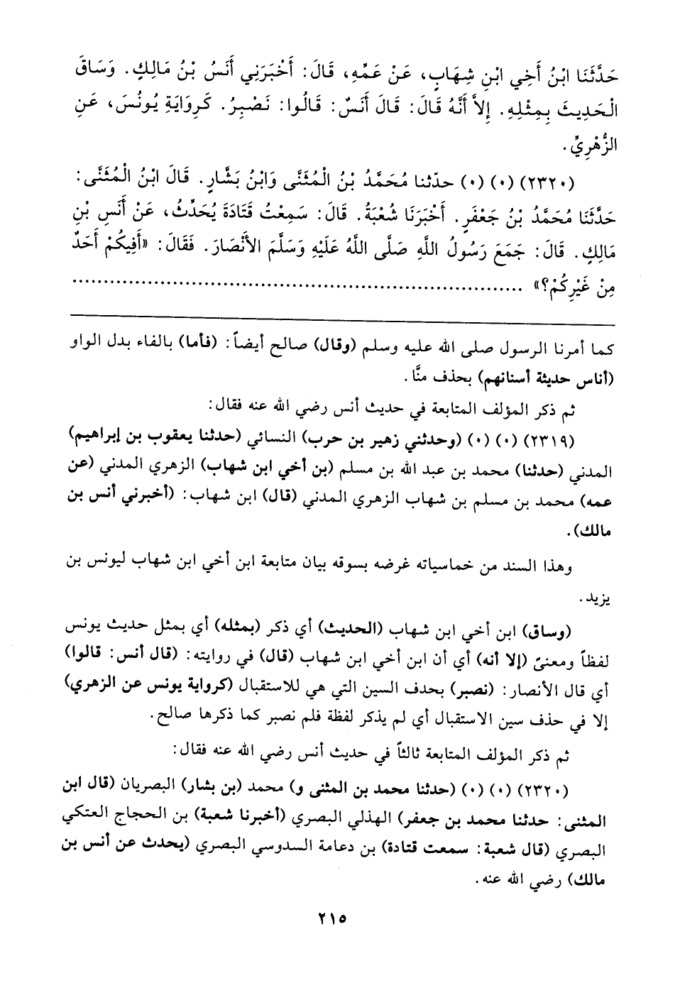 (٢٣١٩) (٠) (٠) (وحدثني زهير بن حرب) النسائي (حدثنا يعقوب بن إبراهيم) المدني (حدثنا) محمد بن عبد الله بن مسلم (بن أخي ابن شهاب) الزهري المدني (عن عمه) محمد بن مسلم بن شهاب الزهري المدني (قال) ابن شهاب: (أخبرني أنس بن مالك).