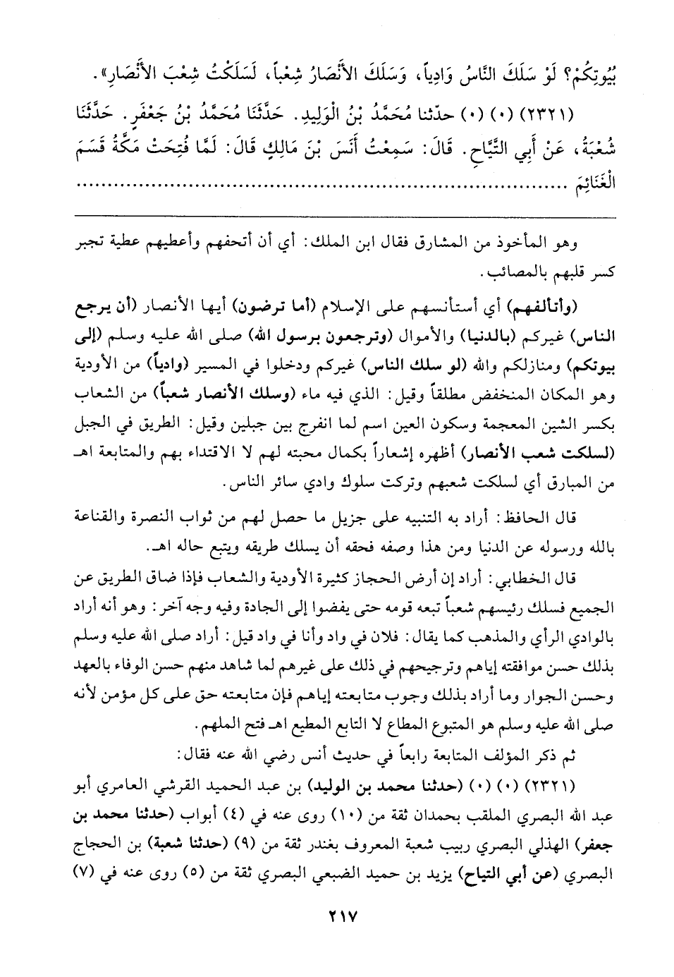 بُيُوتِكُمْ؟ لَوْ سَلَكَ النَّاسُ وَادِيًا، وَسَلَكَ الأنصَارُ شِعْبًا، لَسَلَكْتُ شِعْبَ الأَنْصَارِ".