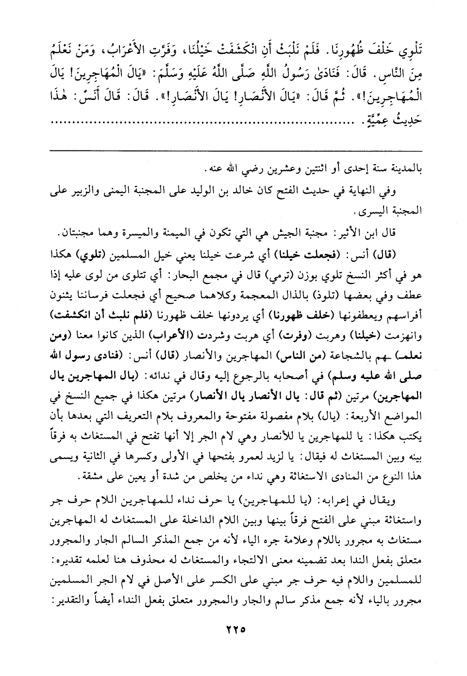 تَلْوي خَلْفَ ظُهُورِنَا. فَلَمْ نَلْبَثْ أَنِ انْكَشَفَتْ خَيلُنَا، وَفَرَّتِ الأَعْرَابُ، وَمَنْ نَعْلَمُ مِنَ النَّاسِ. قَال: فَنَادَى رَسُولُ اللهِ صَلَّى اللهُ عَلَيهِ وَسَلَّمَ: "يَال الْمُهَاجِرِينَ! يَالَ الْمُهَاجِرِينَ! " ثُمَّ قَال: "يَال الأنصَارِ! يَال الأنصَارِ! ". قَال: قَال أَنَسٌ: هذَا حَدِيثُ عِمِّيَّةٍ