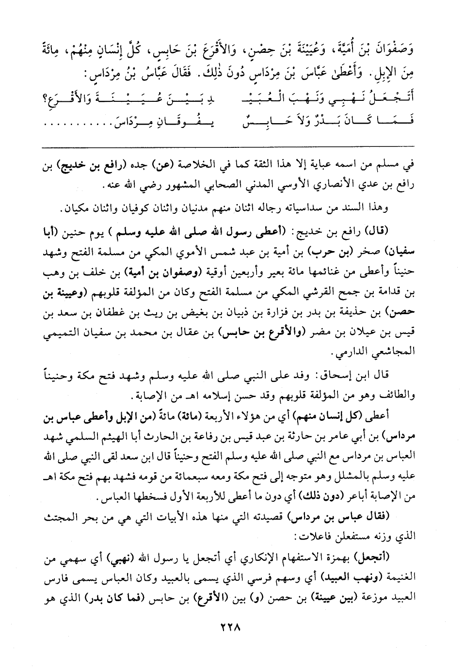 وَصَفْوَانَ بْنَ أُمَيَّةَ، وَعُيَينَةَ بْنَ حِصْنٍ، وَالأَقْرَعَ بْنَ حَابِسٍ، كُلَّ إِنْسَانِ مِنْهُمْ، مِائَةً مِنَ الإِبِلِ. وَأَعْطَى عَبَّاسَ بْنَ مِرْدَاسٍ دُونَ ذلِكَ. فَقَال عَبَّاسُ بْنُ مِرْدَاسٍ: