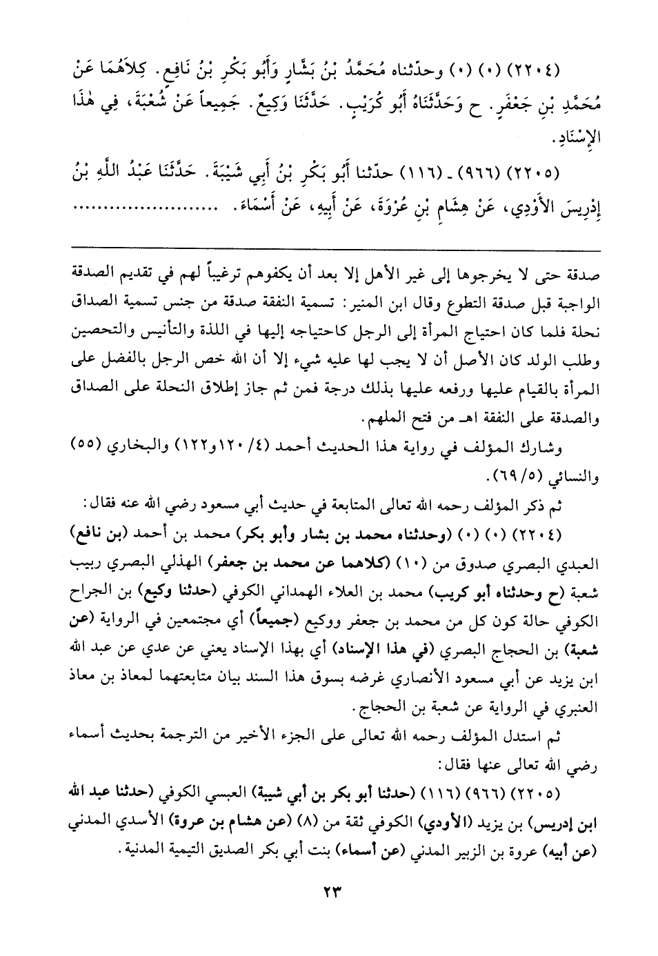 (٢٢٠٥) (٩٦٦) (١١٦) (حدثنا أبو بكر بن أبي شيبة) العبسي الكوفي (حدثنا عبد الله بن إدريس) بن يزيد (الأودي) الكوفي ثقة من (٨) (عن هشام بن عروة) الأسدي المدني (عن أبيه) عروة بن الزبير المدني (عن أسماء) بنت أبي بكر الصديق التيمية المدنية.