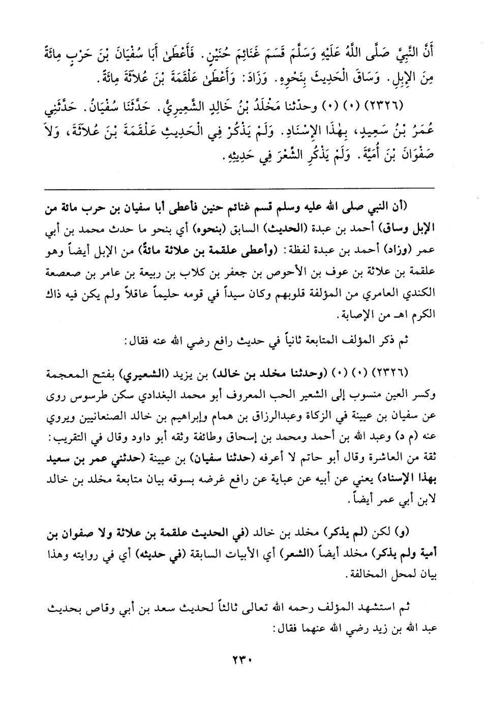 أَنَّ النَّبِيَّ صَلَّى اللهُ عَلَيهِ وَسَلَّمَ قَسَمَ غَنَائِمَ حُنَينٍ. فَأَعْطَى أَبَا سُفْيَانَ بْنَ حَرْبٍ مِائَةً مِنَ الإِبِلِ. وَسَاقَ الْحَدِيثَ بِنَحْوهِ. وَزَادَ: وَأَعْطَى عَلْقَمَةَ بْنَ عُلاثَةَ مِائَةً.