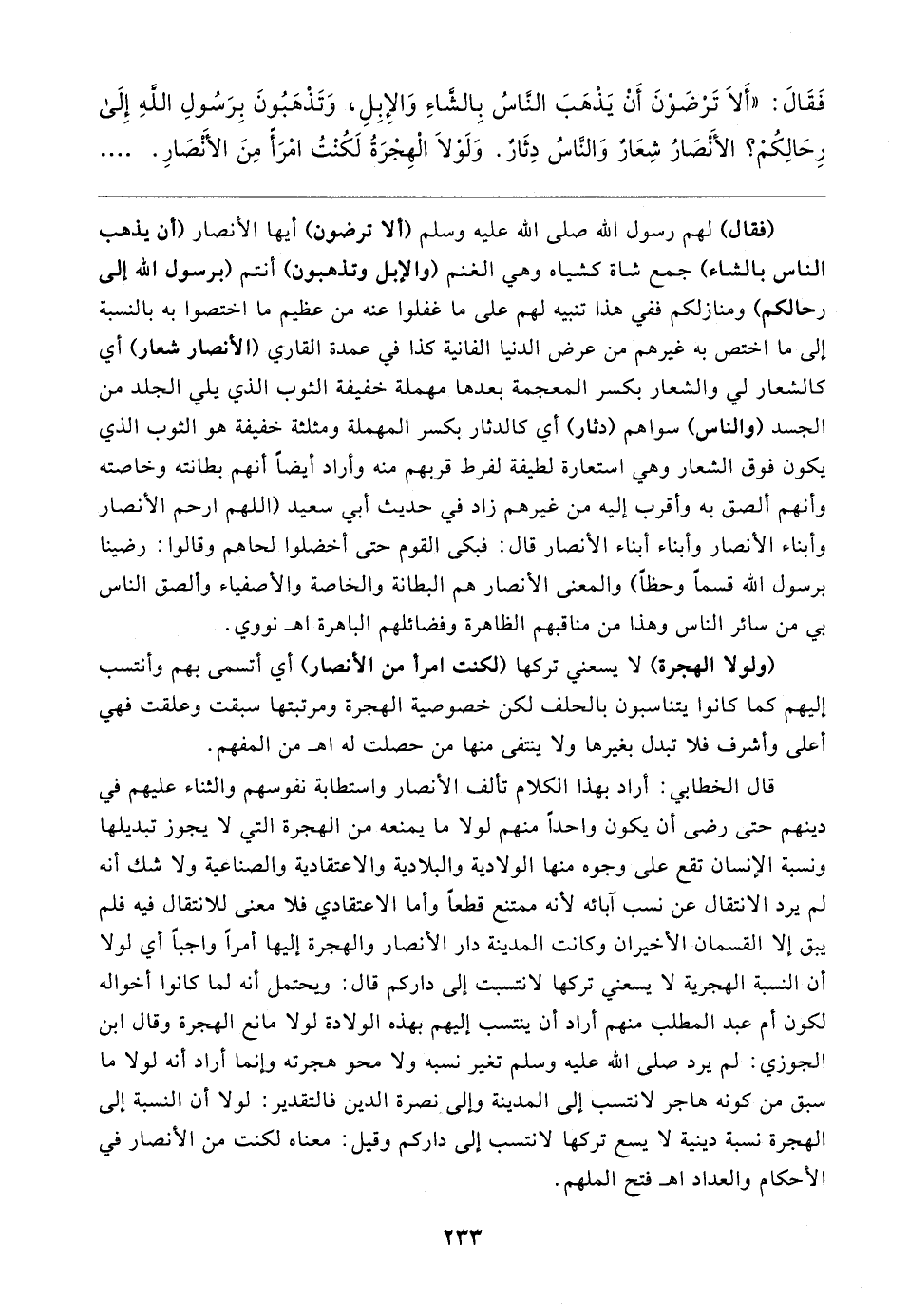 فَقَال: "أَلا تَرْضَوْنَ أَنْ يَذْهَبَ النَّاسُ بِالشَّاءِ وَالإِبِلِ، وَتَذْهَبُونَ بِرَسُولِ اللهِ إِلَى رِحَالِكُمْ؟ الأَنْصارُ شِعَارٌ وَالنَّاسُ دِثَارٌ. وَلَوْلا الْهِجْرَةُ لَكُنْتُ امْرَأ مِنَ الأَنْصارِ