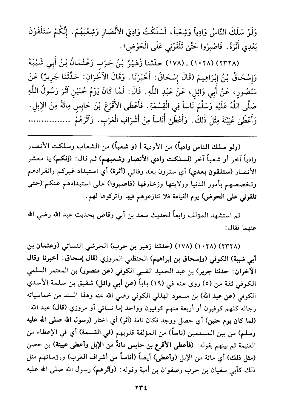 (٢٣٢٨) (١٠٢٨) (١٧٨) (حدثنا زهير بن حرب) الحرشي النسائي (وعثمان بن أبي شيبة) الكوفي (وإسحاق بن إبراهيم) الحنظلي المروزي (قال إسحاق: أخبرنا وقال الآخران: حدثنا جرير) بن عبد الحميد الضبي الكوفي (عن منصور) بن المعتمر السلمي الكوفي ثقة من (٥) روى عنه في (١٩) بابا (عن أبي وائل) شقيق بن سلمة الأسدي الكوفي (عن عبد الله) بن مسعود الهذلي الكوفي رضي الله عنه وهذا السند من خماسياته رجاله كلهم كوفيون أو أربعة منهم كوفيون وواحد إما نسائي أو مروزي (قال) عبد الله: (لما كان يوم حنين) أي حصل ووجد فكان تامة (آثر) أي اختار (رسول الله صلى الله عليه وسلم) من بين المسلمين (ناسًا) من المؤلفة قلوبهم (في القسمة) أي في الإعطاء من الغنيمة ثم بينهم بقوله: (فأعطى الأقرع بن حابس مائةً من الإبل وأعطى عيينة) بن حصن (مثل ذلك) أي مائة من الإبل (وأعطى) أيضًا (أناسًا من أشراف العرب) ورؤسائهم مثل ذلك كأبي سفيان بن حرب وصفوان بن أمية وقوله: (وآثرهم) رسول الله صلى الله عليه