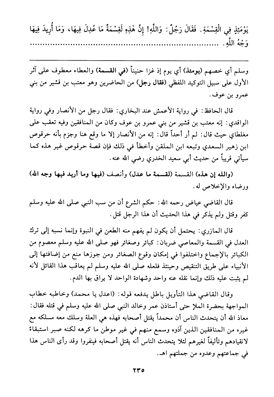 وقال القاضي هذا التأويل باطل يدفعه قوله: (اعدل يا محمد) وخاطبه خطاب المواجهة بحضرة الملإ حتى أستأذن عمر وخالد النبي صلى الله عليه وسلم في قتله فقال: معاذ الله أن يتحدث الناس أن محمدًا يقتل أصحابه فهذه هي العلة وسلك معه مسلكه مع غيره من المنافقين الذين آذوه وسمع منهم في غير موطن ما كرهه لكنه صبر استبقاءً لانقيادهم وتأليفًا لغيرهم لئلا يتحدث الناس أنه يقتل أصحابه فينفروا وقد رأى الناس هذا في جماعتهم وعدوه من جملتهم اهـ.