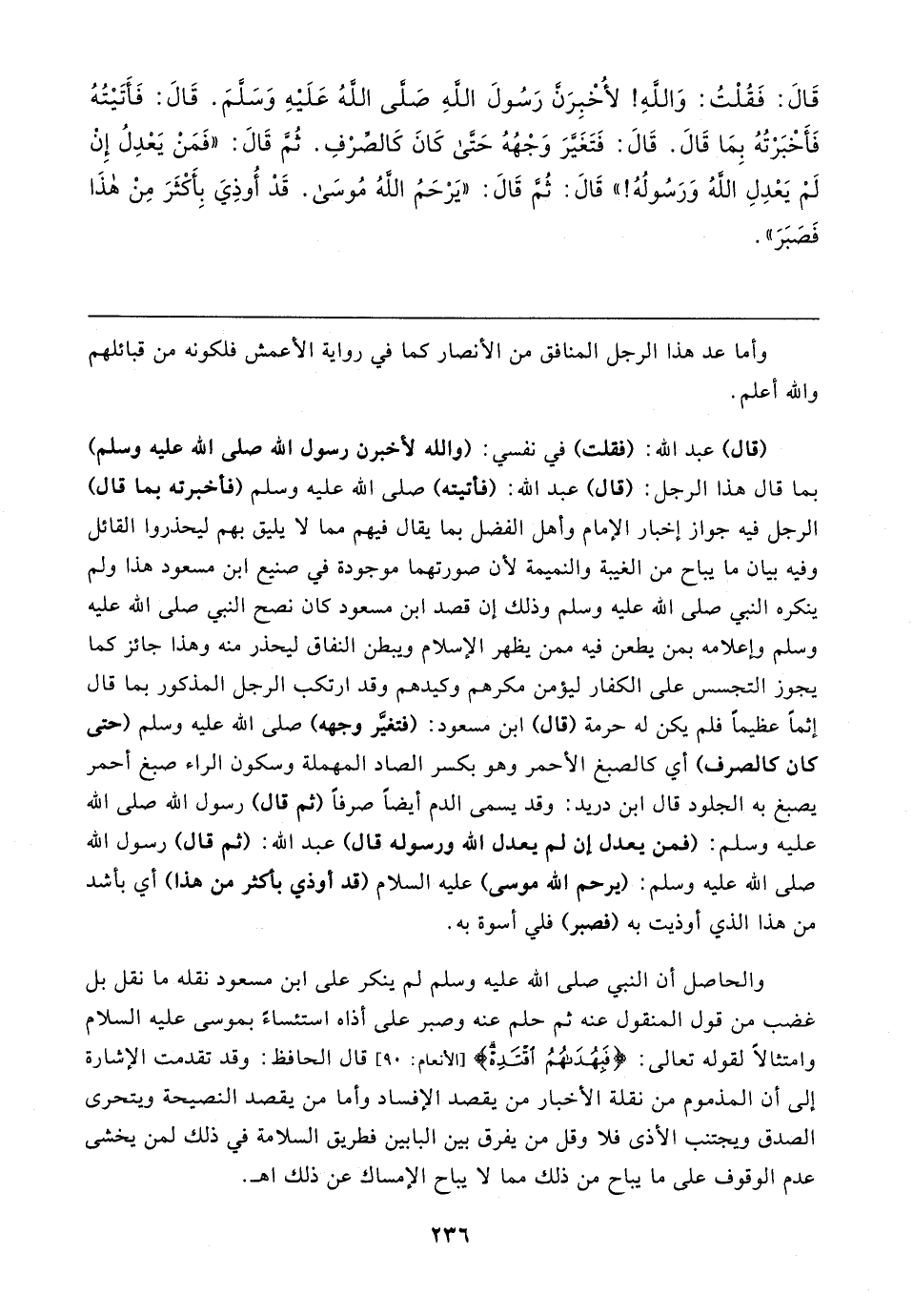 والحاصل أن النبي صلى الله عليه وسلم لم ينكر على ابن مسعود نقله ما نقل بل غضب من قول المنقول عنه ثم حلم عنه وصبر على أذاه استئساءً بموسى - عليه السلام - وامتثالًا لقوله تعالى: {فَبِهُدَاهُمُ اقْتَدِهْ} [الأنعام: ٩٠] قال الحافظ: وقد تقدمت الإشارة إلى أن المذموم من نقلة الأخبار من يقصد الإفساد وأما من يقصد النصيحة ويتحرى الصدق ويجتنب الأذى فلا وقل من يفرق بين البابين فطريق السلامة في ذلك لمن يخشى عدم الوقوف على ما يباح من ذلك مما لا يباح الإمساك عن ذلك اهـ.