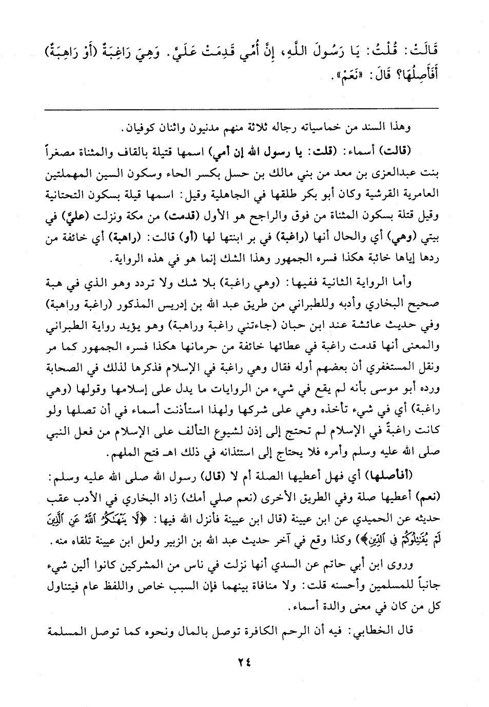 وأما الرواية الثانية ففيها: (وهي راغبة) بلا شك ولا تردد وهو الذي في هبة صحيح البخاري وأدبه وللطبراني من طريق عبد الله بن إدريس المذكور (راغبة وراهبة) وفي حديث عائشة عند ابن حبان (جاءتني راغبة وراهبة) وهو يؤيد رواية الطبراني والمعنى أنها قدمت راغبة في عطائها خائفة من حرمانها هكذا فسره الجمهور كما مر ونقل المستغفري أن بعضهم أوله فقال وهي راغبة في الإسلام فذكرها لذلك في الصحابة ورده أبو موسى بأنه لم يقع في شيء من الروايات ما يدل على إسلامها وقولها (وهي راغبة) أي في شيء تأخذه وهي على شركها ولهذا استأذنت أسماء في أن تصلها ولو كانت راغبة في الإسلام لم تحتج إلى إذن لشيوع التألف على الإسلام من فعل النبي - صلى الله عليه وسلم - وأمره فلا يحتاج إلى استئذانه في ذلك اهـ فتح الملهم.