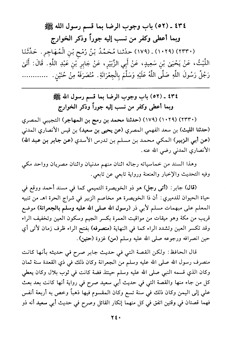 (٢٣٣٠) (١٠٢٩) - (١٧٩) حدَّثنا مُحَمَّدُ بْنُ رُمْحِ بْنِ الْمُهَاجِرِ. حَدَّثَنَا اللَّيثُ، عَنْ يَحْيَى بْنِ سَعِيدٍ، عَنْ أَبِي الزُّبَيرِ، عَنْ جَابِرِ بْنِ عَبْدِ اللهِ. قَال: أَتَى رَجُل رَسُولَ اللهِ صَلَّى اللهُ عَلَيهِ وَسَلَّمَ بِالْجِعْرَانَةِ. مُنْصَرَفَهُ مِنْ حُنَينٍ