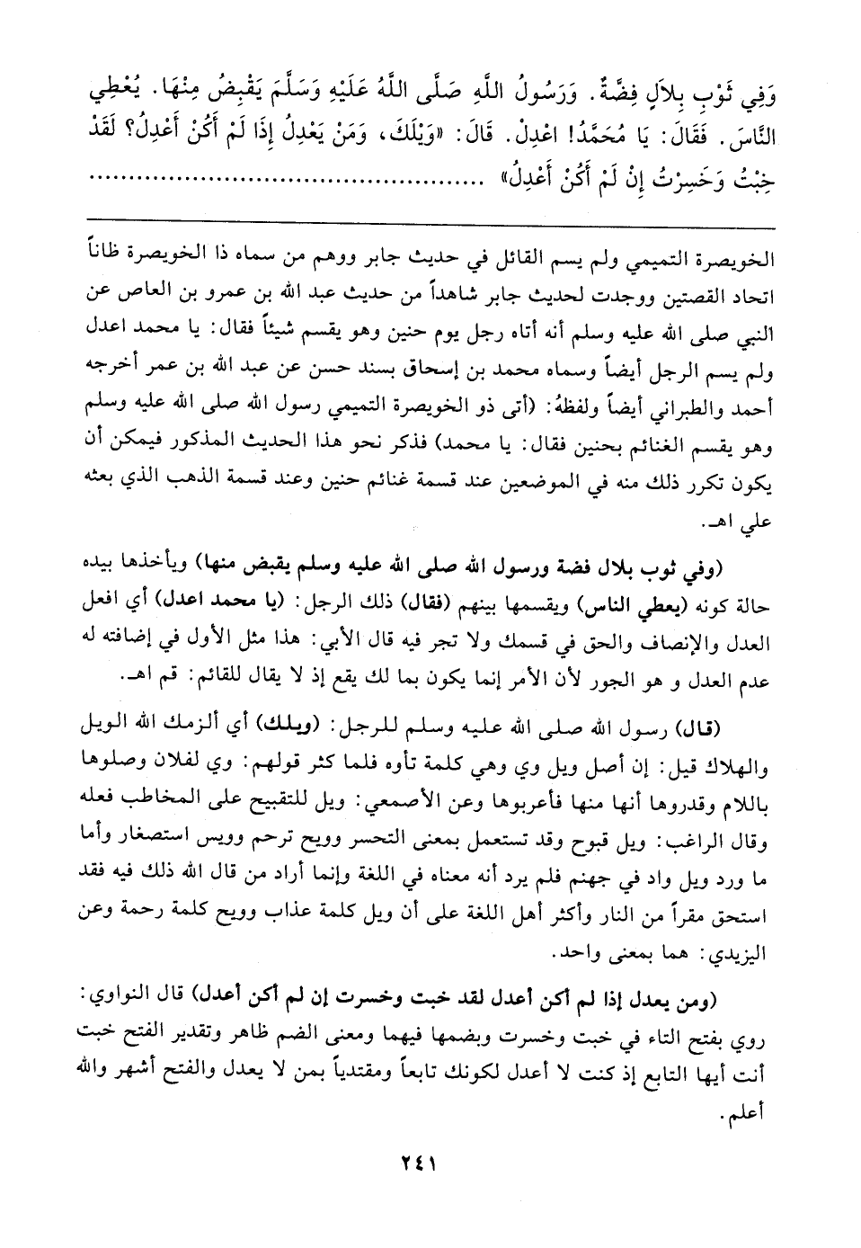 وَفِي ثَوْبِ بِلالٍ فِضَّةٌ. وَرَسُولُ اللهِ صَلَّى اللهُ عَلَيهِ وَسَلَّمَ يَقْبِضُ مِنْهَا. يُعْطِي النَّاسَ. فَقَال: يَا مُحَمَّدُ! اعْدِلْ. قَال: "وَيلَكَ، وَمَنْ يَعْدِلُ إِذَا لَمْ أَكُنْ أَعْدِلُ؟ لَقَدْ خِبْت وَخَسِرْتُ إِنْ لَمْ أَكُنْ أَعْدِلُ"