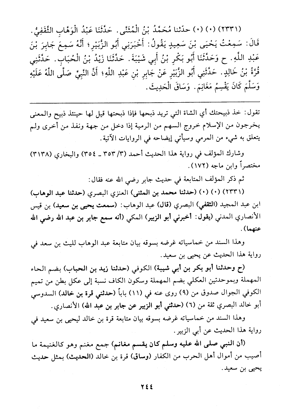 (٢٣٣١) (٠) (٠) حدَّثنا مُحَمَّدُ بْنُ الْمُثَنَّى. حَدَّثَنَا عَبْدُ الْوَهَّابِ الثَّقَفِيُّ. قَال: سَمِعْتُ يَحْيَى بْنَ سَعِيدٍ يَقُولُ: أَخْبَرَنِي أَبُو الزُّبَيرِ؛ أَنَّهُ سَمِعَ جَابِرَ بْنَ عَبْدِ اللهِ. ح وَحَدَّثَنَا أَبُو بَكْرِ بْنُ أَبِي شَيبَةَ. حَدَّثَنَا زَيدُ بْنُ الْحُبَابِ. حَدَّثَنِي قُرَّةُ بْنُ خَالِدٍ. حَدَّثَنِي أَبُو الزُّبَيرِ عَنْ جَابِرِ بْنِ عَبْدِ اللهِ؛ أَنَّ النَّبِيِّ صَلَّى اللهُ عَلَيهِ وَسَلَّمَ كَانَ يَقْسِمُ مَغَانِمَ. وَسَاقَ الْحَدِيثَ