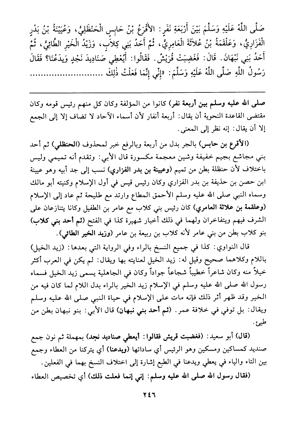 صَلَّى اللهُ عَلَيهِ وَسَلَّمَ بَينَ أَرْبَعَةِ نَفَرٍ: الأَقْرَعُ بْنُ حَابِسٍ الْحَنْظَلِيُّ، وَعُيَينَةُ بْنُ بَدْرٍ الْفَزَارِيُّ، وَعَلْقَمَةُ بْنُ عُلاثَةَ الْعَامِرِيُّ، ثُمَّ أَحَدُ بَنِي كِلابٍ، وَزَيدُ الْخَيرِ الطَّائِيُّ، ثُمَّ أَحَدُ بَنِي نَبْهَانَ. قَال: فَغَضِبَتْ قُرَيشٌ. فَقَالُوا: أَيُعْطِي صَنَادِيدَ نَجْدٍ وَيدَعُنَا؟ فَقَال رَسُولُ اللهِ صَلَّى اللَّهُ عَلَيهِ وَسَلَّمَ: "إِنِّي إِنَّمَا فَعَلْتُ ذلِكَ