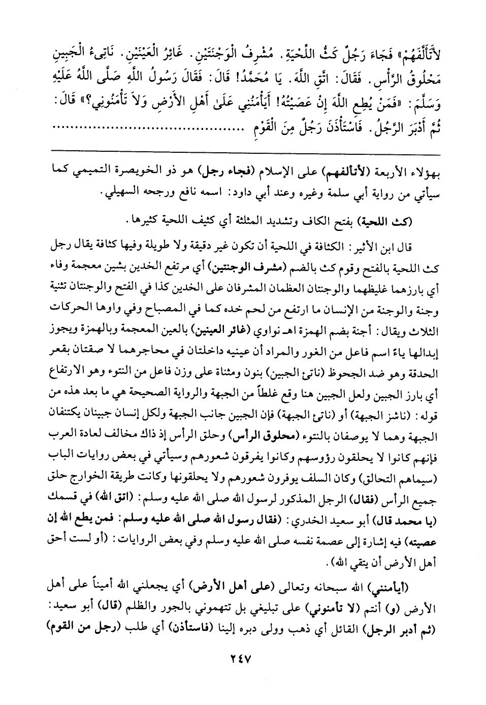 لأَتَأَلَّفَهُمْ" فَجَاءَ رَجُلٌ كَثُّ اللِّحْيَةِ. مُشْرِفُ الْوَجْنَتَينِ. غَائِرُ الْعَينَينِ. نَاتِئُ الْجَبِينِ مَحْلُوقُ الرَّأْسِ. فَقَال: اتَّقِ اللهَ. يَا مُحَمَّدُ! قَال: فَقَال رَسُولُ اللهِ صَلَّى اللهُ عَلَيهِ وَسَلَّمَ: "فَمَنْ يُطِعِ اللهَ إِنْ عَصَيتُهُ! أَيَأْمَنُنِي عَلَى أَهْلِ الأَرْضِ وَلَا تَأْمَنُونِي؟ " قَال: ثُمَّ أَدْبَرَ الرَّجُلُ. فَاسْتَأْذَنَ رَجُلٌ مِنَ الْقَوْمِ