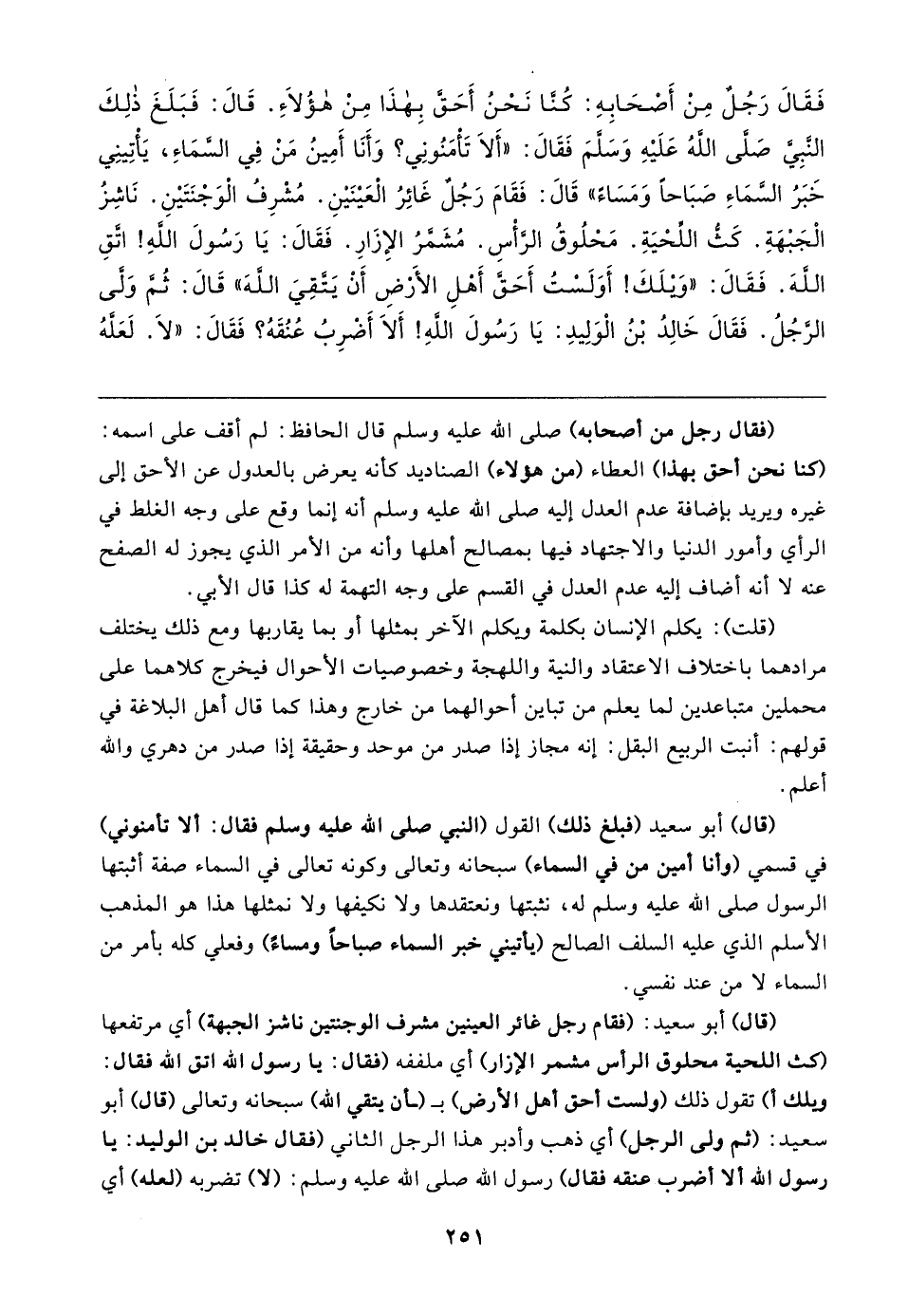 فَقَال رَجُلٌ مِنْ أَصْحَابِهِ: كُنَّا نَحْنُ أَحَقَّ بِهذَا مِنْ هؤُلاءِ. قَال: فَبَلَغَ ذلِكَ النَّبِيَّ صَلَّى اللهُ عَلَيهِ وَسَلَّمَ فَقَال: "أَلا تَأْمَنُونِي؟ وَأَنَا أَمِينُ مَنْ فِي السَّمَاءِ، يَأْتِينِي خَبَرُ السَّمَاءِ صَبَاحًا وَمَسَاءً" قَال: فَقَامَ رَجُلٌ غَائِرُ الْعَينَينِ. مُشْرِفُ الْوَجْنَتَينِ. نَاشِزُ الْجَبْهَةِ. كَثُّ اللِّحْيَةِ. مَحْلُوقُ الرَّأْسِ. مُشَمَّرُ الإِزَارِ. فَقَال: يَا رَسُولَ اللهِ! اتَّقِ اللهَ. فَقَال: "وَيلَكَ! أَوَلَسْتُ أَحَقَّ أَهْلِ الأرْضِ أَنْ يَتَّقِيَ اللهَ" قَال: ثُمَّ وَلَّى الرَّجُلُ. فَقَال خَالِدُ بْنُ الْوَلِيدِ: يَا رَسُولَ اللهِ! أَلا أَضْرِبُ عُنُقَهُ؟ فَقَال: "لَا. لَعَلَّهُ