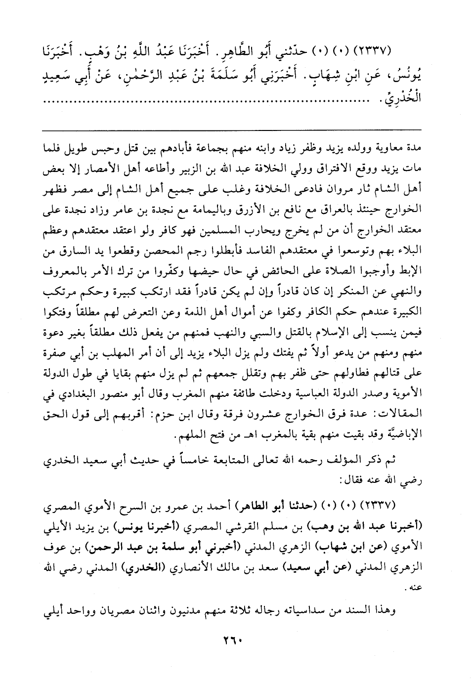 (٢٣٣٧) (٠) (٠) (حدثنا أبو الطاهر) أحمد بن عمرو بن السرح الأموي المصري (أخبرنا عبد الله بن وهب) بن مسلم القرشي المصري (أخبرنا يونس) بن يزيد الأيلي الأموي (عن ابن شهاب) الزهري المدني (أخبرني أبو سلمة بن عبد الرحمن) بن عوف الزهري المدني (عن أبي سعيد) سعد بن مالك الأنصاري (الخدري) المدني رضي الله عنه.