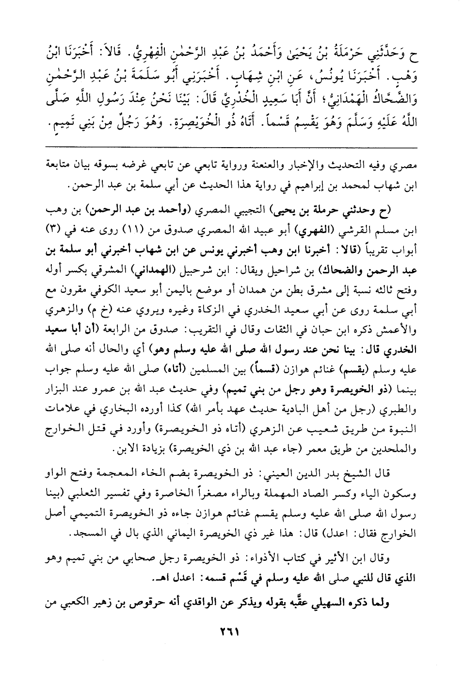 ح وَحَدَّثَنِي حَرْمَلَةُ بْنُ يَحْيَى وَأَحْمَدُ بْنُ عَبْدِ الرَّحْمنِ الْفِهْرِيُّ. قَالا: أَخْبَرَنَا ابْنُ وَهْبٍ. أَخْبَرَنَا يُونُسُ، عَنِ ابْنِ شِهَابٍ. أَخْبَرَنِي أَبُو سَلَمَةَ بْنُ عَبْدِ الرَّحْمْنِ وَالضَّحَّاكُ الْهَمْدَانِيُّ؛ أَنَّ أَبَا سَعِيدٍ الْخُدْرِيَّ قَال: بَينَا نَحْنُ عِنْدَ رَسُولِ اللهِ صَلَّى اللهُ عَلَيهِ وَسَلَّمَ وَهُوَ يَقْسِمُ قَسْمًا. أَتَاهُ ذُو الْخُوَيصِرَةِ. وَهُوَ رَجُلٌ مِنْ بَنِي تَمِيمٍ