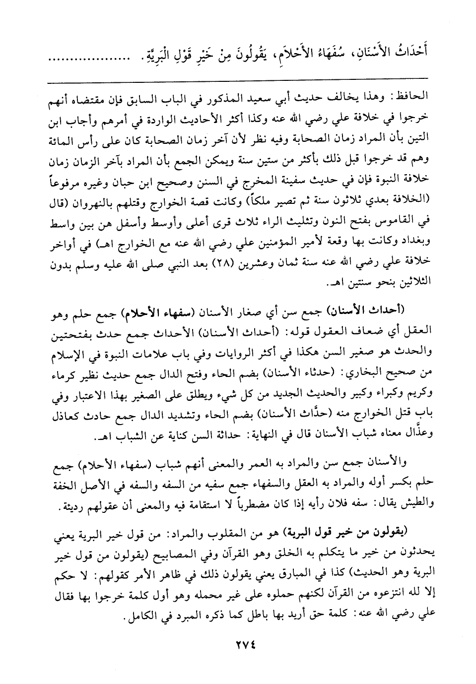 (أحداث الأسنان) جمع سن أي صغار الأسنان (سفهاء الأحلام) جمع حلم وهو العقل أي ضعاف العقول قوله: (أحداث الأسنان) الأحداث جمع حدث بفتحتين والحدث هو صغير السن هكذا في أكثر الروايات وفي باب علامات النبوة في الإسلام من صحيح البخاري: (حدثاء الأسنان) بضم الحاء وفتح الدال جمع حديث نظير كرماء وكريم وكبراء وكبير والحديث الجديد من كل شيء ويطلق على الصغير بهذا الاعتبار وفي باب قتل الخوارج منه (حدَّاث الأسنان) بضم الحاء وتشديد الدال جمع حادث كعاذل وعذَّال معناه شباب الأسنان قال في النهاية: حداثة السن كناية عن الشباب اهـ.