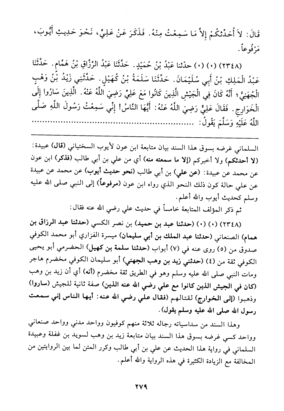 وهذا السند من سداسياته رجاله ثلاثة منهم كوفيون وواحد مدني وواحد صنعاني وواحد كسي غرضه بسوق هذا السند بيان متابعة زيد بن وهب لسويد بن غفلة وعبيدة السلماني في رواية هذا الحديث عن علي بن أبي طالب وكرر المتن لما بين الروايتين من المخالفة مع الزيادة الكثيرة في هذه الرواية والله أعلم.