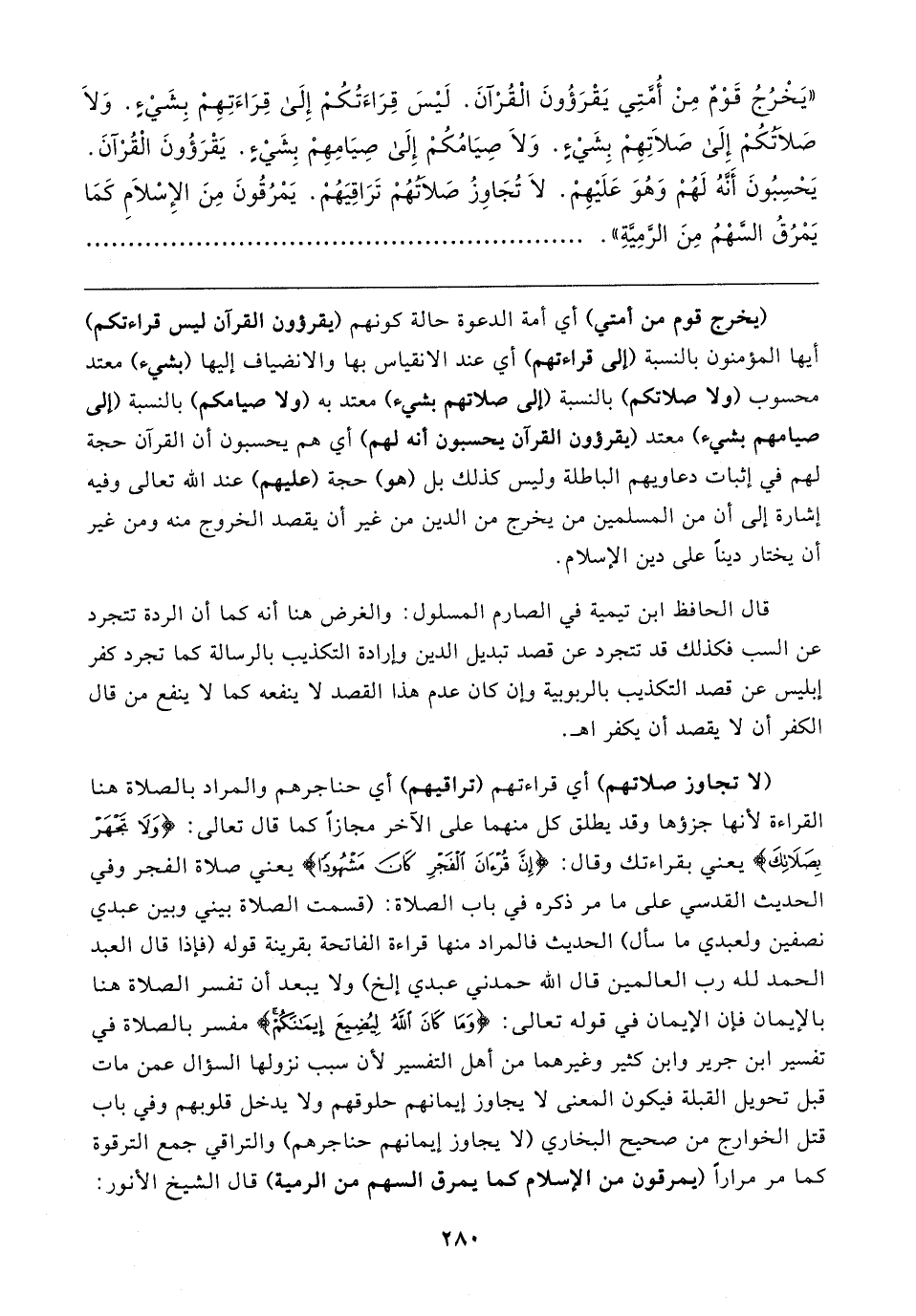 "يَخْرُجُ قَوْمٌ مِنْ أُمَّتِي يَقْرَؤُونَ الْقُرْآنَ. لَيسَ قِرَاءَتُكُمْ إِلَى قِرَاءَتِهِمْ بِشَيءٍ. وَلَا صلاتُكُمْ إِلَى صلاتِهِمْ بِشَيءٍ. وَلَا صِيَامُكُمْ إلَى صِيَامِهِمْ بِشَيءٍ. يَقْرَؤُونَ الْقُرآنَ. يَحْسِبُونَ أَنَّهُ لَهُمْ وَهُوَ عَلَيهِمْ. لَا تُجَاوزُ صَلاتَهُمْ تَرَاقِيَهُمْ. يَمْرُقُونَ مِنَ الإِسْلامِ كَمَا يَمْرُقُ السَّهْمُ مِنَ الرَّمِيَّةِ"