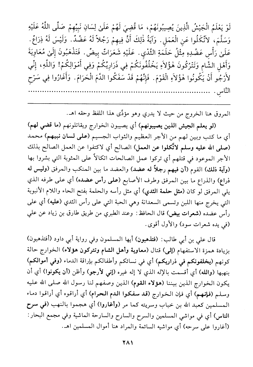 قال علي بن أبي طالب: (فتذهبون) أيها المسلمون وفي رواية أبي داود (أفتذهبون) بزيادة همزة الاستفهام (إلى) قتال (معاوية وأهل الشام وتتركون هولاء) الخوارج حالة كونهم (يخلفونكم في ذراريكم) أي في نسائكم وأطفالكم بإراقة الدماء (وفي أموالكم) بنهبها (والله) أي أقسمت بالإله الذي لا إله غيره (إني لأرجو) وأظن (أن يكونوا) أي أن يكون الخوارج الذين بيننا (هولاء القوم) الذين وصفهم لنا رسول الله صلى الله عليه وسلم (فإنهم) أي فإن الخوارج (قد سفكوا الدم الحرام) أي أراقوه أي أراقوا دماء المسلمين كعبد الله بن خباب وسريته كما مر (وأغاروا) أي هجموا بالنهب (في سرح الناس) أي في مواشي المسلمين والسرح والسارح والسارحة الماشية وفي مجمع البحار: (أغاروا على سرحه) أي مواشيه السائمة والمراد هنا أموال المسلمين اهـ.