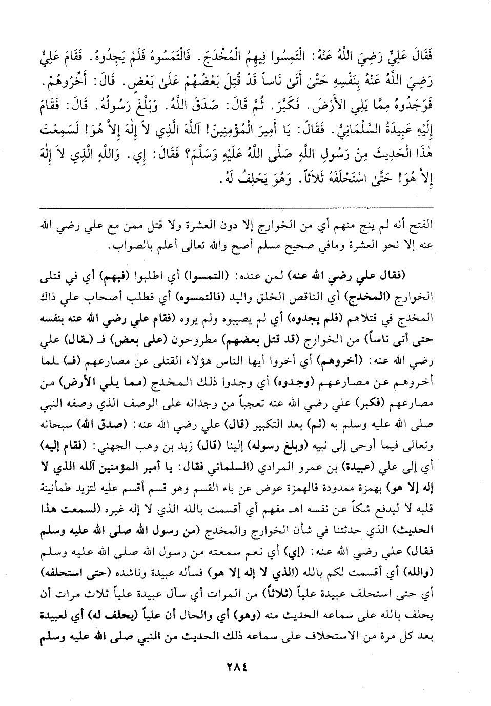 فَقَال عَلِيٌّ رَضِيَ اللهُ عَنْهُ: الْتَمِسُوا فِيهِمُ الْمُخْدَجَ. فَالْتَمَسُوهُ فَلَمْ يَجِدُوهُ. فَقَامَ عَلِيٌّ رَضِيَ اللَّهُ عَنْهُ بِنَفْسِهِ حَتَّى أَتَى نَاسًا قَدْ قُتِلَ بَعْضُهُمْ عَلَى بَعْضٍ. قَال: أَخرُوهُمْ. فَوَجَدُوهُ مِمَّا يَلِي الأرضَ. فَكَبَّرَ. ثُمَّ قَال: صَدَقَ اللهُ. وَبَلَّغَ رَسُولُهُ. قَال: فَقَامَ إِلَيهِ عَبِيدَةُ السَّلْمَانِيُّ. فَقَال: يَا أَمِيرَ الْمُؤْمِنِينَ! آللهَ الَّذِي لَا إِلهَ إِلَّا هُوَ! لَسَمِعْتَ هذَا الْحَدِيثَ مِنْ رَسُولِ اللهِ صَلَّى اللهُ عَلَيهِ وَسَلَّمَ؟ فَقَال: إِي. وَاللهِ الَّذِي لَا إِلهَ إِلَّا هُوَ! حَتَّى اسْتَحْلَفَهُ ثَلاثًا. وَهُوَ يَحْلِفُ لَهُ