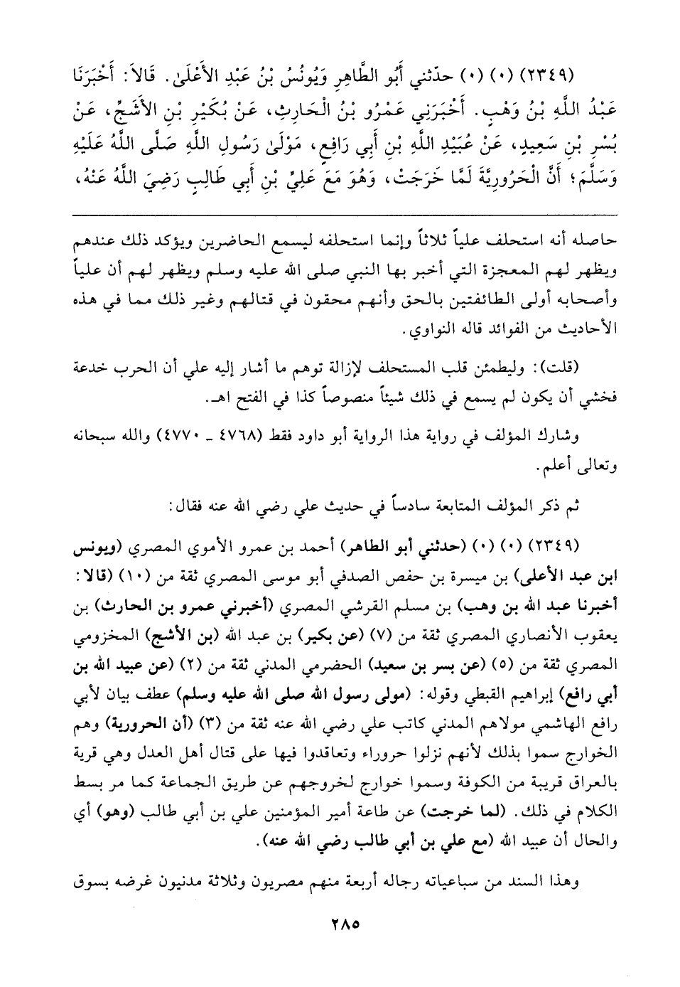 (٢٣٤٩) (٠) (٠) (حدثني أبو الطاهر) أحمد بن عمرو الأموي المصري (ويونس بن عبد الأعلى) بن ميسرة بن حفص الصدفي أبو موسى المصري ثقة من (١٠) (قالا: أخبرنا عبد الله بن وهب) بن مسلم القرشي المصري (أخبرني عمرو بن الحارث) بن يعقوب الأنصاري المصري ثقة من (٧) (عن بكير) بن عبد الله (بن الأشج) المخزومي المصري ثقة من (٥) (عن بسر بن سعيد) الحضرمي المدني ثقة من (٢) (عن عبيد الله بن أبي رافع) إبراهيم القبطي وقوله: (مولى رسول الله صلى الله عليه وسلم) عطف بيان لأبي رافع الهاشمي مولاهم المدني كاتب علي رضي الله عنه ثقة من (٣) (أن الحرورية) وهم الخوارج سموا بذلك لأنهم نزلوا حروراء وتعاقدوا فيها على قتال أهل العدل وهي قرية بالعراق قريبة من الكوفة وسموا خوارج لخروجهم عن طريق الجماعة كما مر بسط الكلام في ذلك. (لما خرجت) عن طاعة أمير المؤمنين علي بن أبي طالب (وهو) أي والحال أن عبيد الله (مع علي بن أبي طالب رضي الله عنه).