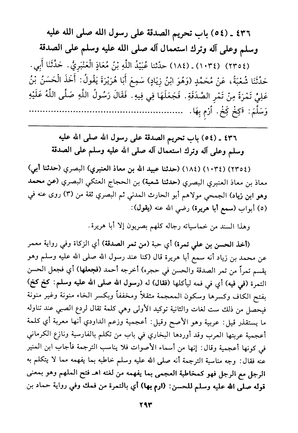 ٤٣٦ - (٥٤) باب تحريم الصدقة على رسول الله صلى الله عليه وسلم وعلى آله وترك استعمال آله صلى الله عليه وسلم على الصدقة