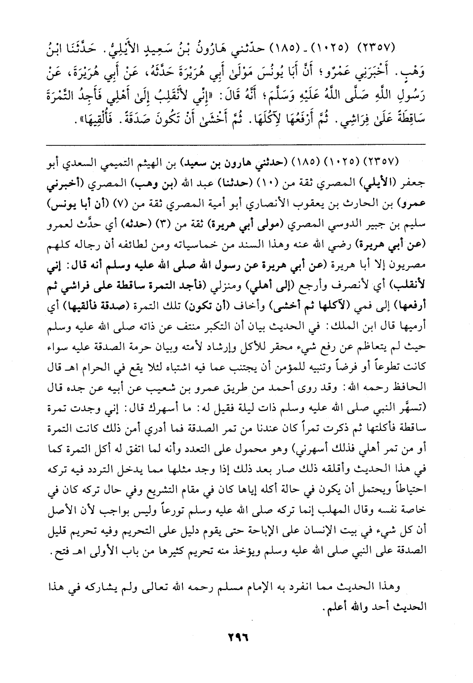 (٢٣٥٧) (١٠٢٥) - (١٨٥) حدَّثني هَارُونُ بْنُ سَعِيدٍ الأيلِيُّ. حَدَّثَنَا ابْنُ وَهْبٍ. أَخْبَرَنِي عَمْرٌو، أن أَبَا يُونُسَ مَوْلَى أَبِي هُرَيرَةَ حَدَّثَهُ، عَنْ أَبِي هُرَيرَةَ، عَنْ رَسُولِ اللهِ - صلى الله عليه وسلم -، أَنهُ قَال: "إِني لأَنْقَلِبُ إِلَى أَهْلِي فَأجِدُ التَّمْرَةَ سَاقِطَةً عَلَى فِرَاشِي. ثُمَّ أَرْفَعُهَا لِآكُلَهَا. ثُمَّ أَخْشَى أَنْ تَكُونَ صَدَقَةً. فَأُلْقِيهَا"