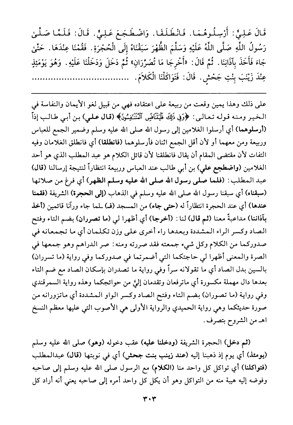على ذلك وهذا يمين وقعت من ربيعة على اعتقاده فهي من قبيل لغو الأيمان والنفاسة في الخير ومنه قوله تعالى: {وَفِي ذَلِكَ فَلْيَتَنَافَسِ الْمُتَنَافِسُونَ} (قال علي) بن أبي طالب إذًا (أرسلوهما) أي أرسلوا الغلامين إلى رسول الله صلى الله عليه وسلم وضمير الجمع للعباس وربيعة ومن معهما أو لأن أقل الجمع اثنان فأرسلوهما (فانطلقا) أي فانطلق الغلامان وفيه التفات لأن مقتضى المقام أن يقال فانطلقنا لأن قائل الكلام هو عبد المطلب الذي هو أحد الغلامين (واضطجع علي) بن أبي طالب عند العباس وربيعة انتظارًا لنتيجة إرسالنا (قال) عبد المطلب: (فلما صلى رسول الله صلى الله عليه وسلم الظهر) أي فرغ من صلاتها (سبقناه) أي سبقنا رسول الله صلى الله عليه وسلم في الذهاب (إلى الحجرة) الشريفة (نقمنا عندها) أي عند الحجرة انتظارًا له (حتى جاء) من المسجد (فـ) ـلما جاء ورآنا قائمين (أخذ بآذاننا) مداعبةً معنا (ثم قال) لنا: (أخرجا) أي أظهرا لي (ما تصرران) بضم التاء وفتح الصاد وكسر الراء المشددة وبعدها راء أخرى على وزن تكلمان أي ما تجمعانه في صدوركما من الكلام وكل شيء جمعته فقد صررته ومنه: صر الدراهم وهو جمعها في الصرة والمعنى أظهرا لي حاجتكما التي أضمرتما في صدوركما وفي رواية (ما تسرران) بالسين بدل الصاد أي ما تقولانه سرًّا وفي رواية ما تصدران بإسكان الصاد مع ضم التاء بعدها دال مهملة مكسورة أي ما ترفعان وتقدمان إليَّ من حوائجكما وهذه رواية السمرقندي وفي رواية (ما تصوران) بضم التاء وفتح الصاد وكسر الواو المشددة أي ماتزورانه من صورة حديثكما وهي رواية الحميدي والرواية الأولى هي الأصوب التي عليها معظم النسخ اهـ من الشروح بتصرف.