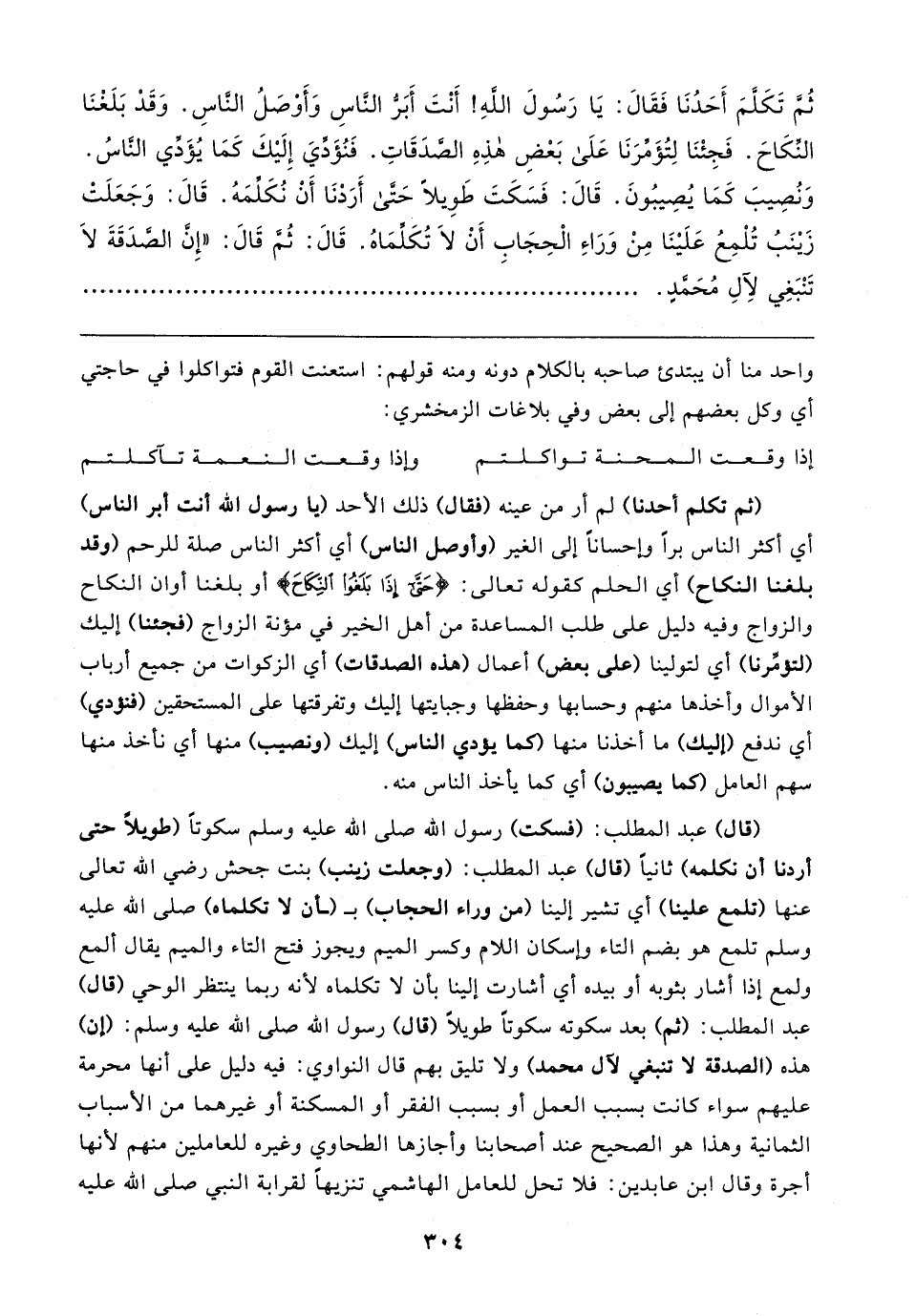 ثُمَّ تَكَلَّمَ أَحَدُنَا فَقَال: يَا رَسُولَ اللهِ! أَنْتَ أَبَرُّ النَّاسِ وَأَوْصَلُ النَّاسِ. وَقَدْ بَلَغْنَا النكَاحَ. فَجِئْنَا لِتُؤَمِّرَنَا عَلَى بَعْضِ هذِهِ الصَّدَقَاتِ. فَنُؤَدِّيَ إِلَيكَ كَمَا يُؤَذي النَّاسُ. وَنُصِيبَ كَمَا يُصِيبُونَ. قَال: فَسَكَتَ طَويلَّا حَتَّى أَرَدْنَا أَنْ نُكَلِّمَهُ. قَال: وَجَعَلَتْ زَينَبُ تُلْمِعُ عَلَينَا مِنْ وَرَاءِ الْحِجَابِ أَنْ لَا تُكَلِّمَاهُ. قَال: ثُمَّ قَال: "إِن الصَّدَقَةَ لَا تَنْبَغِي لِآلِ مُحَمَّدٍ