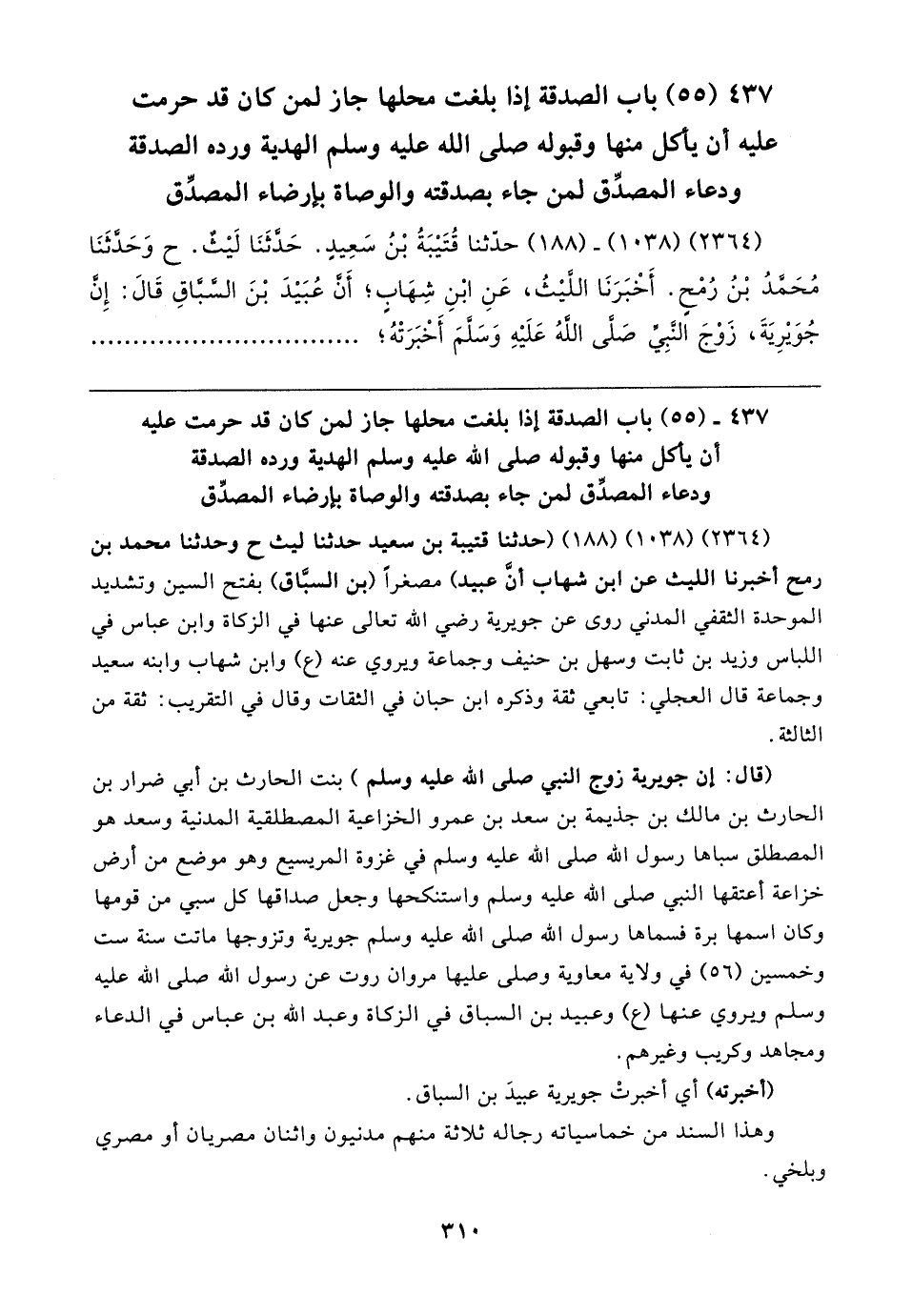 (٢٣٦٤) (١٠٣٨) - (١٨٨) حدَّثنا قُتَيبَةُ بْنُ سَعِيدٍ. حَدَّثَنَا لَيث. ح وَحَدَّثَنَا مُحَمَّدُ بْنُ رُمْحٍ. أَخْبَرَنَا اللَّيثُ، عَنِ ابْنِ شِهَابٍ؛ أن عُبَيدَ بْنَ السَّبَّاقِ قَال: إِنَّ جُوَيرِيَةَ، زَوْجَ النَّبِيّ - صلى الله عليه وسلم - أَخْبَرَتْهُ؛