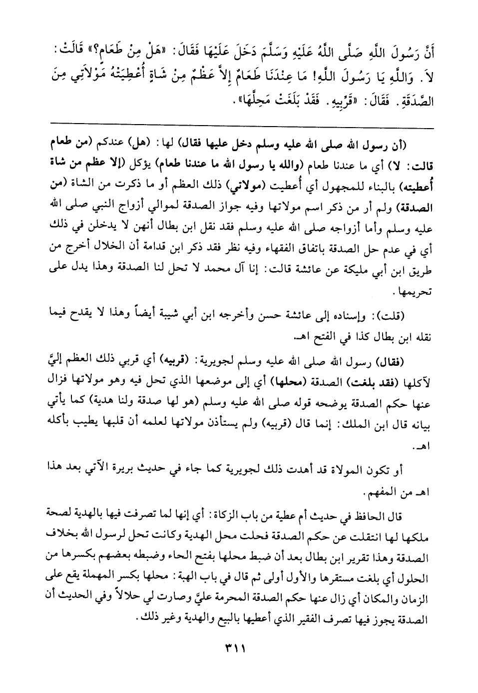 أنِّ رَسُولَ اللهِ - صلى الله عليه وسلم - دَخَلَ عَلَيهَا فَقَال: "هَلْ مِنْ طَعَامٍ؟ " قَالتْ: لَا. وَاللهِ يَا رَسُولَ اللهِ! مَا عِنْدَنَا طَعَامٌ إلا عَظْمٌ مِنْ شَاةٍ أُعْطِيَتْهُ مَوْلاتِي مِنَ الصِّدَقَةِ. فَقَال: "قَرِّبِيهِ. فَقَدْ بَلَغَتْ مَحِلَّهَا"