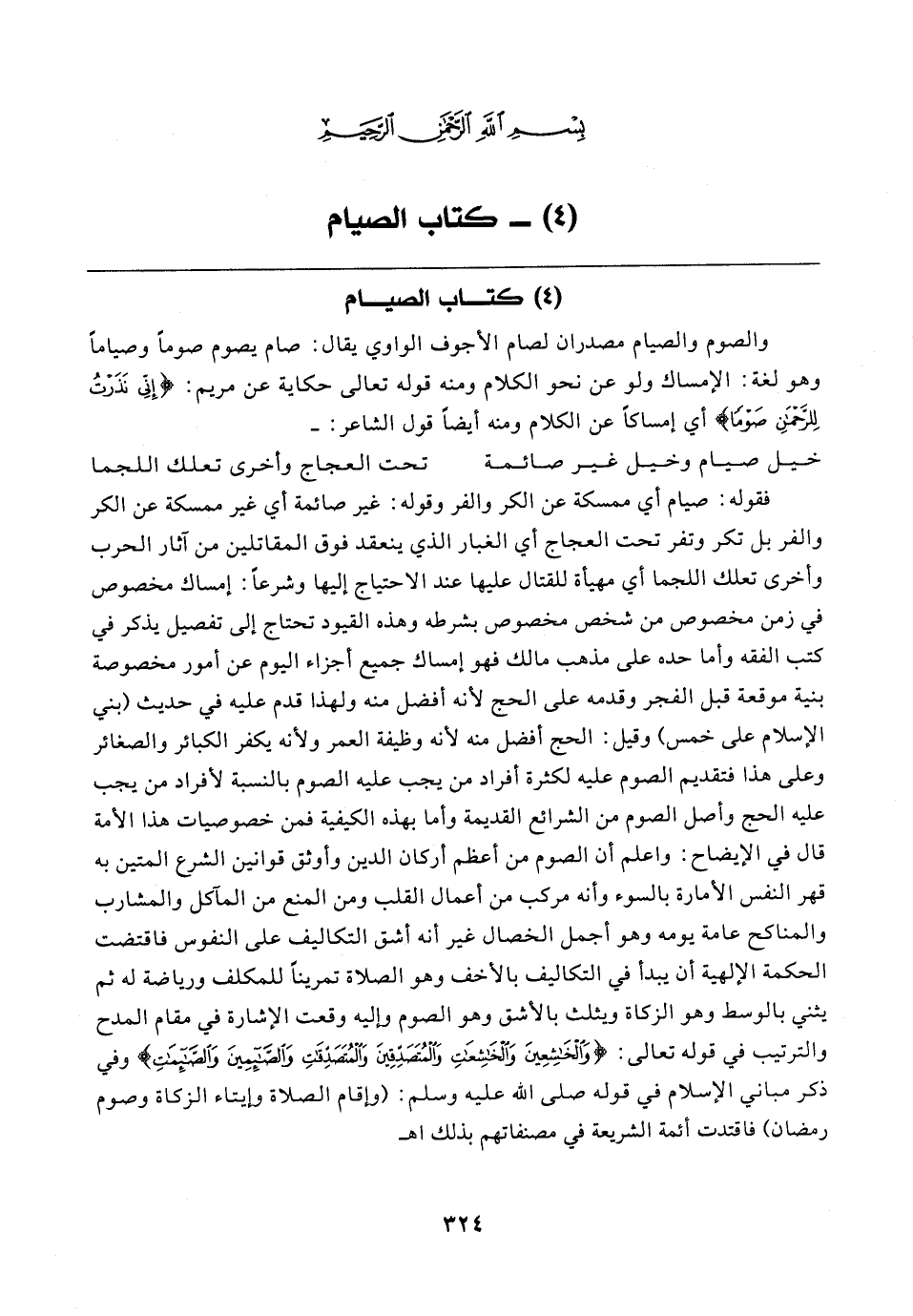 فقوله: صيام أي ممسكة عن الكر والفر وقوله: غير صائمة أي غير ممسكة عن الكر والفر بل تكر وتفر تحت العجاج أي الغبار الذي ينعقد فوق المقاتلين من آثار الحرب وأخرى تعلك اللجما أي مهيأة للقتال عليها عند الاحتياج إليها وشرعًا: إمساك مخصوص في زمن مخصوص من شخص مخصوص بشرطه وهذه القيود تحتاج إلى تفصيل يذكر في كتب الفقه وأما حده على مذهب مالك فهو إمساك جميع أجزاء اليوم عن أمور مخصوصة بنية موقعة قبل الفجر وقدمه على الحج لأنه أفضل منه ولهذا قدم عليه في حديث (بني الإسلام على خمس) وقيل: الحج أفضل منه لأنه وظيفة العمر ولأنه يكفر الكبائر والصغائر وعلى هذا فتقديم الصوم عليه لكثرة أفراد من يجب عليه الصوم بالنسبة لأفراد من يجب عليه الحج وأصل الصوم من الشرائع القديمة وأما بهذه الكيفية فمن خصوصيات هذا الأمة قال في الإيضاح: واعلم أن الصوم من أعظم أركان الدين وأوثق قوانين الشرع المتين به قهر النفس الأمارة بالسوء وأنه مركب من أعمال القلب ومن المنع من المآكل والمشارب والمناكح عامة يومه وهو أجمل الخصال غير أنه أشق التكاليف على النفوس فاقتضت الحكمة الإلهية أن يبدأ في التكاليف بالأخف وهو الصلاة تمرينًا للمكلف ورياضة له ثم يثني بالوسط وهو الزكاة ويثلث بالأشق وهو الصوم وإليه وقعت الإشارة في مقام المدح والترتيب في قوله تعالى: {وَالْخَاشِعِينَ وَالْخَاشِعَاتِ وَالْمُتَصَدِّقِينَ وَالْمُتَصَدِّقَاتِ وَالصَّائِمِينَ وَالصَّائِمَاتِ} وفي ذكر مباني الإسلام في قوله - صلى الله عليه وسلم -: (وإقام الصلاة وإيتاء الزكاة وصوم رمضان) فاقتدت أئمة الشريعة في مصنفاتهم بذلك اهـ
