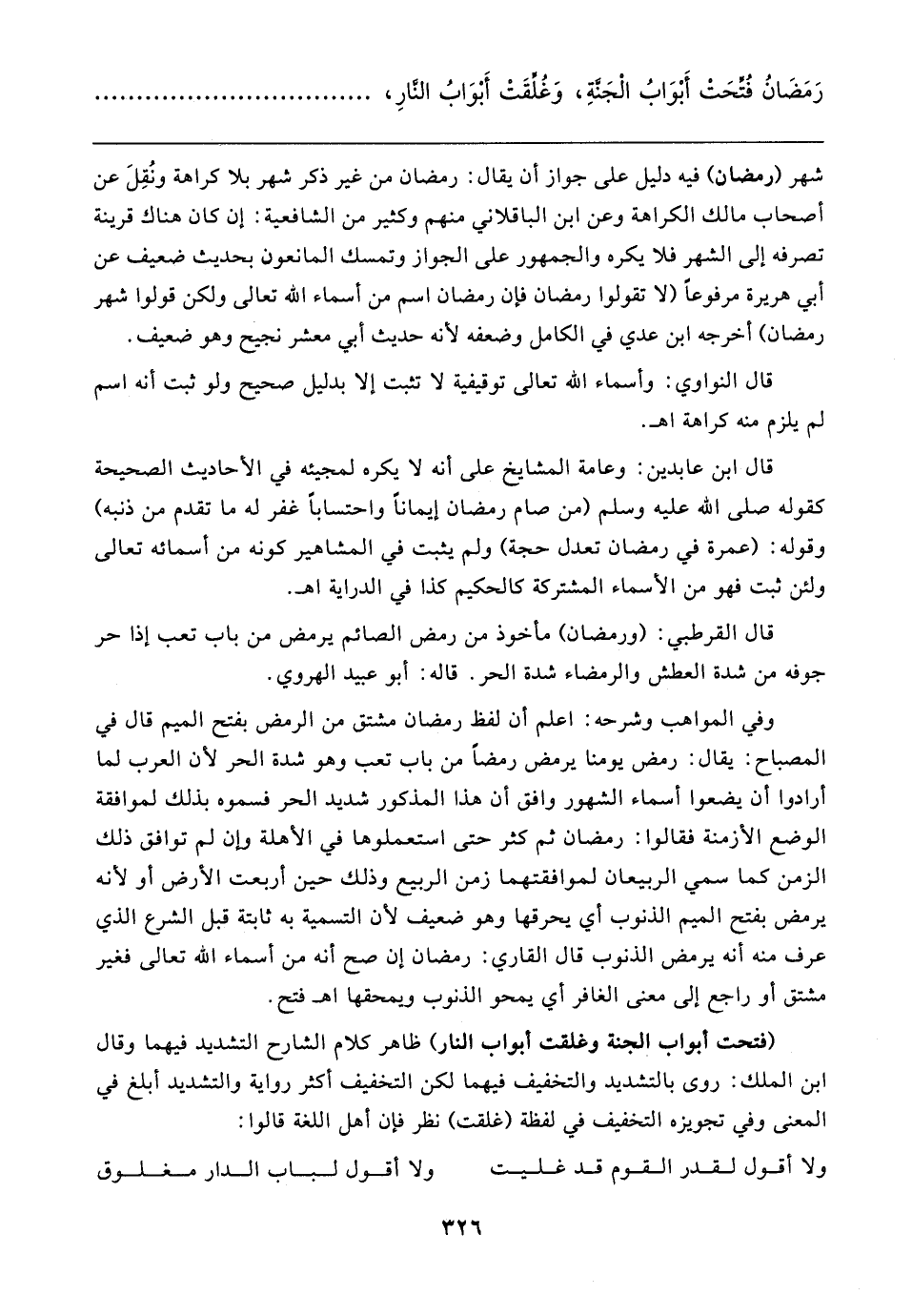 شهر (رمضان) فيه دليل على جواز أن يقال: رمضان من غير ذكر شهر بلا كراهة ونُقِلَ عن أصحاب مالك الكراهة وعن ابن الباقلاني منهم وكثير من الشافعية: إن كان هناك قرينة تصرفه إلى الشهر فلا يكره والجمهور على الجواز وتمسك المانعون بحديث ضعيف عن أبي هريرة مرفوعًا (لا تقولوا رمضان فإن رمضان اسم من أسماء الله تعالى ولكن قولوا شهر رمضان) أخرجه ابن عدي في الكامل وضعفه لأنه حديث أبي معشر نجيح وهو ضعيف.