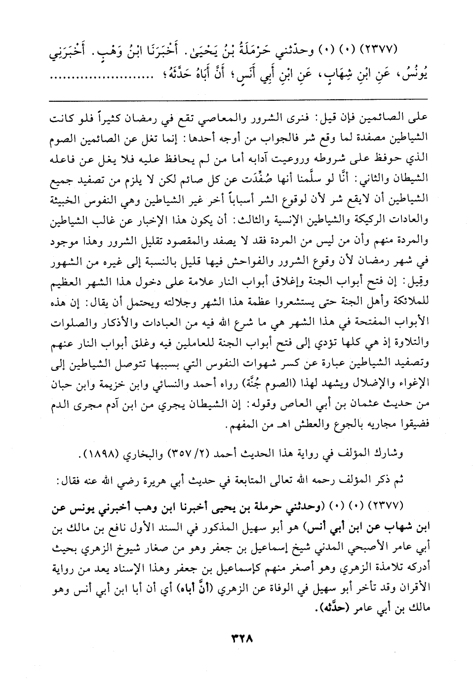 (٢٣٧٧). (٠) (٠) (وحدثني حرملة بن يحيى أخبرنا ابن وهب أخبرني يونس عن ابن شهاب عن ابن أبي أنس) هو أبو سهيل المذكور في السند الأول نافع بن مالك بن أبي عامر الأصبحي المدني شيخ إسماعيل بن جعفر وهو من صغار شيوخ الزهري بحيث أدركه تلامذة الزهري وهو أصغر منهم كإسماعيل بن جعفر وهذا الإسناد يعد من رواية الأقران وقد تأخر أبو سهيل في الوفاة عن الزهري (أن أباه) أي أن أبا ابن أبي أنس وهو مالك بن أبي عامر (حدَّثه).