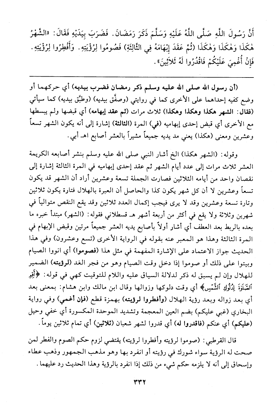 وقوله: (الشهر هكذا) الخ أشار النبي صلى الله عليه وسلم بنشر أصابعه الكريمة العشر ثلاث مرات إلى عدد أيام الشهر ثم عقد إحدى إبهاميه في المرة الثالثة إشارة إلى نقصان واحد من أيامه الثلاثين فصارت الجملة تسعة وعشرين أراد أن الشهر قد يكون تسعًا وعشرين لا أن كل شهر يكون كذا والحاصل أن العبرة بالهلال فتارة يكون ثلاثين وتارة تسعة وعشرين وقد لا يرى فيجب إكمال العدد ثلاثين وقد يقع النقص متواليًا في شهرين وثلاثة ولا يقع في أكثر من أربعة أشهر هـ قسطلاني فقوله: (الشهر) مبتدأ خبره ما بعده بالربط بعد العطف أي أشار أولًا بأصابع يديه العشر جميعًا مرتين وقبض الإبهام في المرة الثالثة وهذا هو المعبر عنه بفوله في الرواية الأخرى (تسع وعشرون) وفي هذا الحديث جواز الاعتماد على الإشارة المفهمة في مثل هذا (فصوموا) أي انووا الصيام وبيتوا على ذلك أو صوموا إذا دخل وقت الصيام وهو من فجر الغد (لرؤيته) الضمير للهلال وإن لم يسبق له ذكر لدلالة السياق عليه واللام للتوقيت كهي في قوله: {أَقِمِ الصَّلَاةَ لِدُلُوكِ الشَّمْسِ} أي وقت دلوكها وزوالها وقال ابن مالك وابن هشام: بمعنى بعد أي بعد زواله وبعد رؤية الهلال (وأفطروا لروبته) بهمزة قطع (فإن أغمي) وفي رواية البخاري (غبي عليكم) بضم العين المعجمة وتشديد الموحدة المكسورة أي خفي وحيل (عليكم) أي عنكم (فاقدروا له) أي قدروا لشهر شعبان (ثلاثين) أي تمام ثلاثين يومًا.