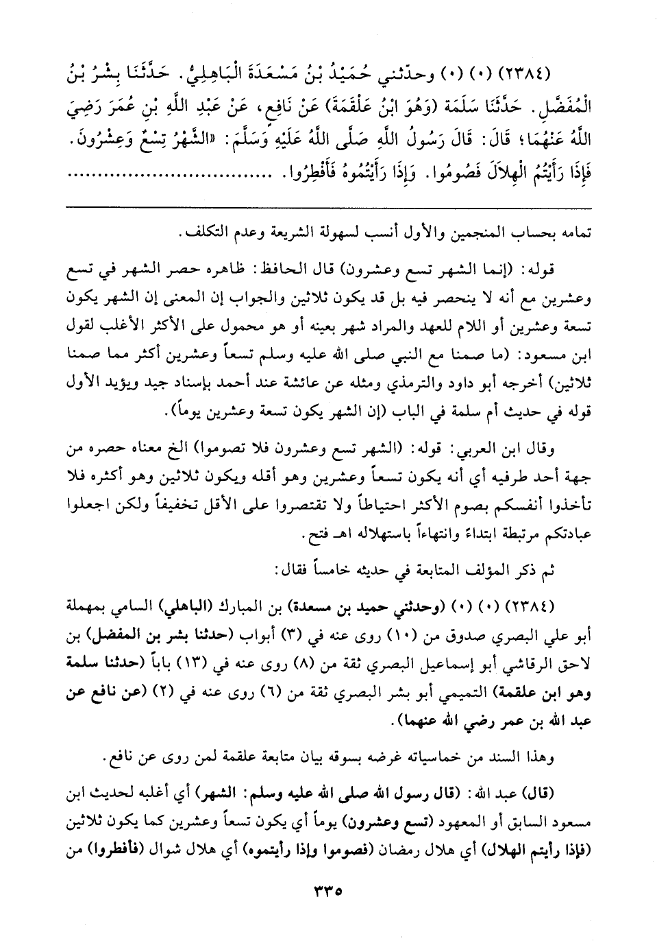 (٢٣٨٤) (٠) (٠) وحدَّثني حُمَيدُ بْنُ مَسْعَدَةَ الْبَاهِلِي. حَدَّثَنَا بِشْرُ بْنُ الْمُفَضَّلِ. حَدَّثَنَا سَلَمَة (وَهُوَ ابْنُ عَلْقَمَةَ) عَنْ نَافِعٍ، عَنْ عَبْدِ اللهِ بْنِ عُمَرَ رَضِيَ اللهُ عَنْهُمَا، قَال: قَال رَسُولُ اللهِ صَلَّى اللهُ عَلَيهِ وَسَلَّمَ: "الشهْرُ تِسْعٌ وَعِشْرُونَ. فَإِذَا رَأَيتُمُ الْهِلَال فَصُومُوا. وَإِذَا رَأَيتُمُوهُ فَأَفْطِرُوا