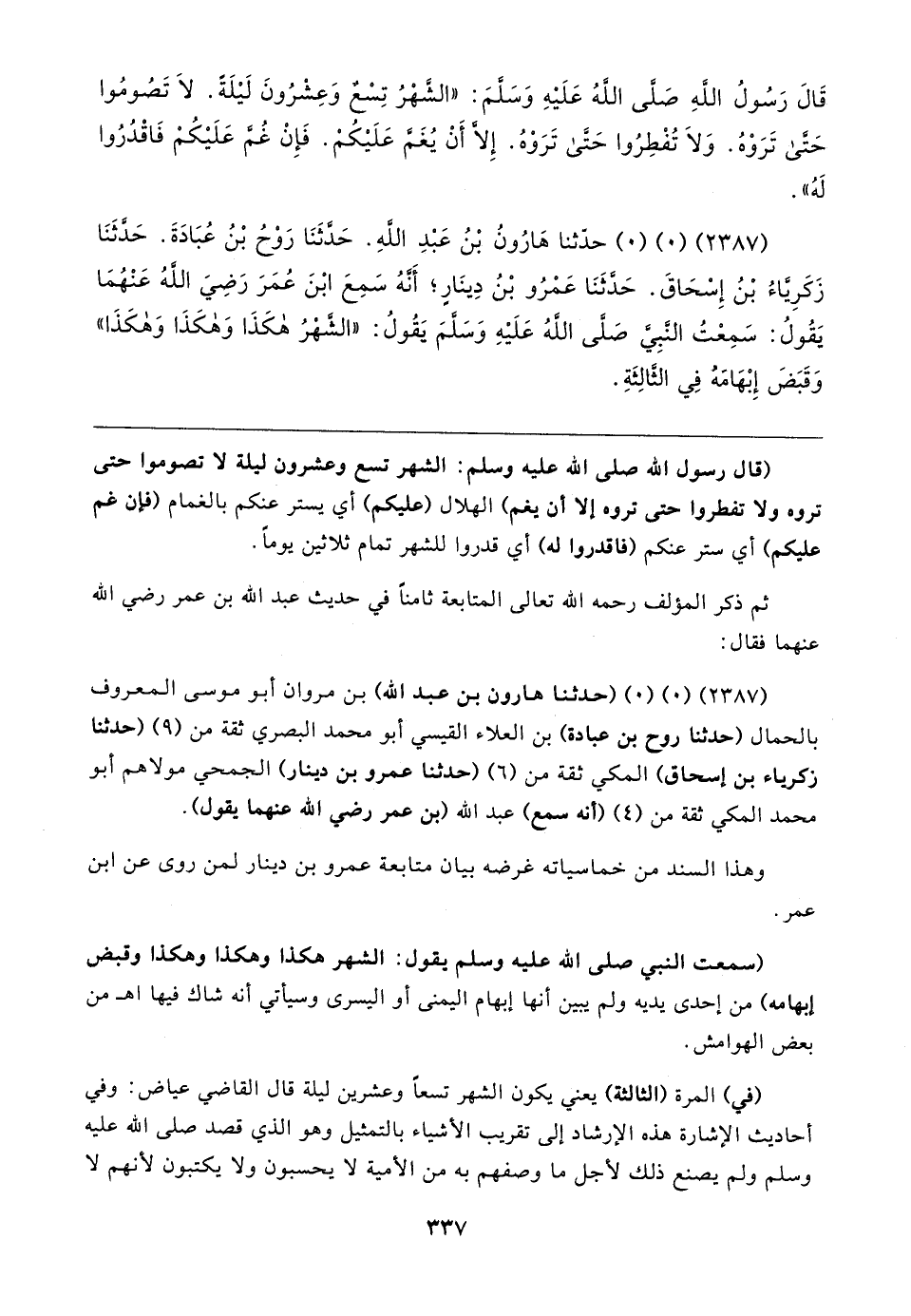 قَال رَسُولُ اللهِ صَلَّى اللهُ عَلَيهِ وَسَلَّمَ: "الشَّهْرُ تِسْعٌ وَعِشْرُونَ لَيلَةً. لَا تَصُومُوا حَتَّى تَرَوْهُ. وَلَا تُفْطِرُوا حَتَّى تَرَوْهُ. إِلا أَنْ يُغَمَّ عَلَيكُمْ. فَإِنْ غُمَّ عَلَيكُمْ فَاقْدُرُوا لَهُ".