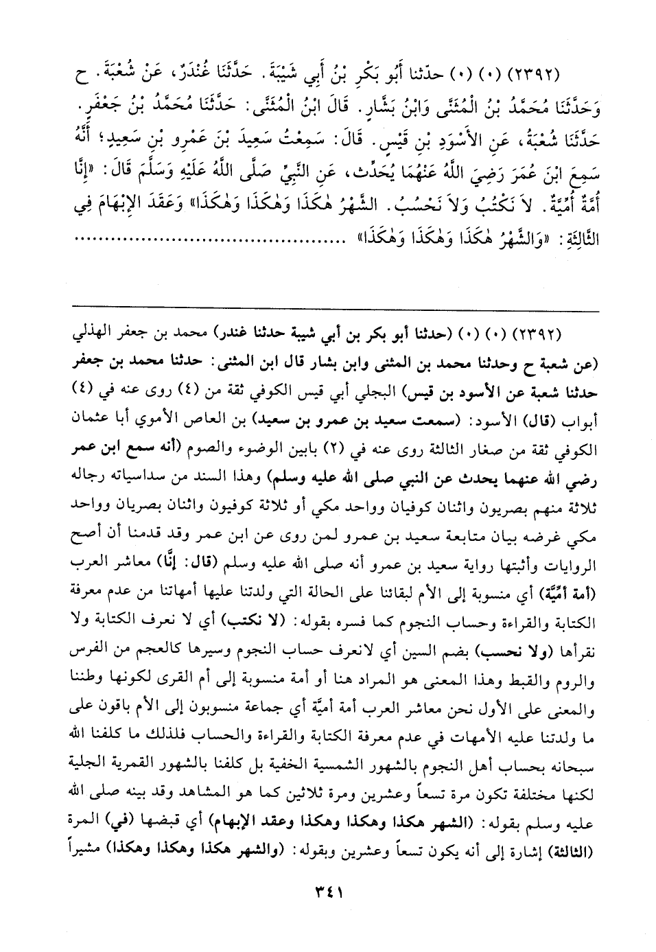 (٢٣٩٢) (٠) (٠) حدَّثنا أَبُو بَكْرٍ بْنُ أَبِي شَيبَةَ. حَدَّثَنَا غُنْدَرٌ، عَنْ شُعْبَةَ. ح وَحدَّثَنَا مُحَمَّدُ بْنُ الْمُثَنَّى وَابْنُ بَشارٍ. قَال ابْنُ الْمُثَنَّى: حَدَّثَنَا مُحَمَّدُ بْنُ جَعْفَرٍ. حَدَّثَنَا شُعْبَةُ، عَنِ الأسوَدِ بْنِ قَيسِ. قَال: سَمِعْتُ سَعِيدَ بْنَ عَمْرِو بْنِ سَعِيدِ؛ أَنَّهُ سَمِعَ ابْنَ عُمَرَ رَضِيَ اللهُ عَنْهُمَا يُحدِّث، عَنِ النَّبِي صَلَّى اللهُ عَلَيهِ وَسَلَّمَ قَال: "إِنَّا أُمَةٌ أُمِّيَّةٌ. لَا نَكْتُبُ وَلَا نَحْسُبُ. الشَّهْرُ هكَذَا وَهكَذَا وَهكَذَا" وَعَقَدَ الإِبْهَامَ في الثَّالِثَةِ: "وَالشَّهْرُ هكَذَا وَهكَذَا وَهكَذَا "