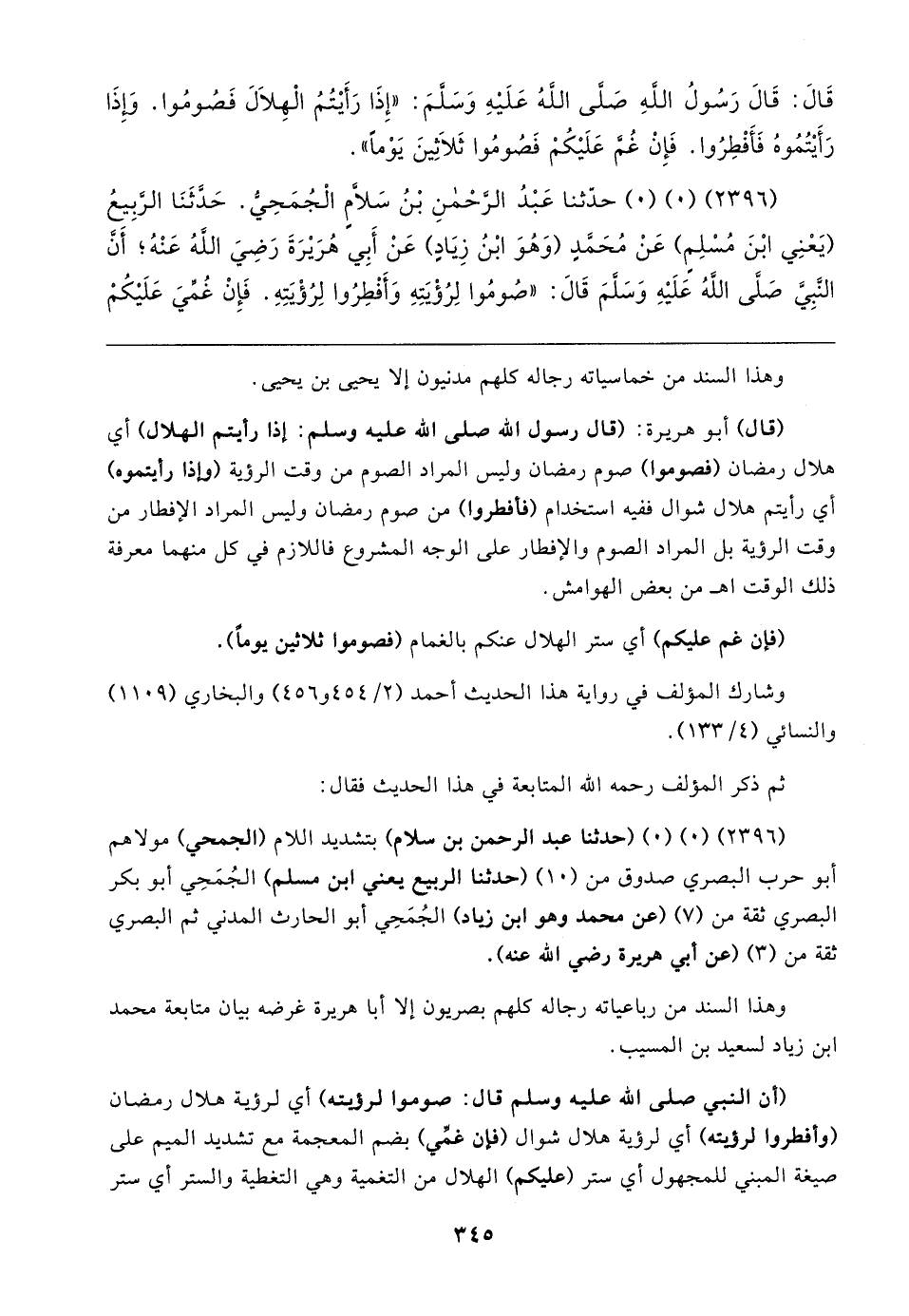 (٢٣٩٦) (٠) (٠) حدَّثنا عَبْدُ الرَّحْمنِ بْنُ سَلَّامٍ الْجُمَحِي. حَدَّثَنَا الرَّبِيعُ (يَعْنِي ابْنَ مُسْلِمٍ) عَنْ مُحَمَّدٍ (وَهُوَ ابْنُ زِيَادٍ) عَنْ أَبِي هُرَيرَةَ رَضِيَ اللهُ عَنْهُ؛ أَنَّ النَّبِي صَلَّى اللهُ عَلَيهِ وَسَلَّمَ قال: "صُومُوا لِرُؤْيَتِهِ وَأَفْطِرُوا لِرُؤْيَتِهِ. فَإِنْ غُمِّيَ عَلَيكُمْ