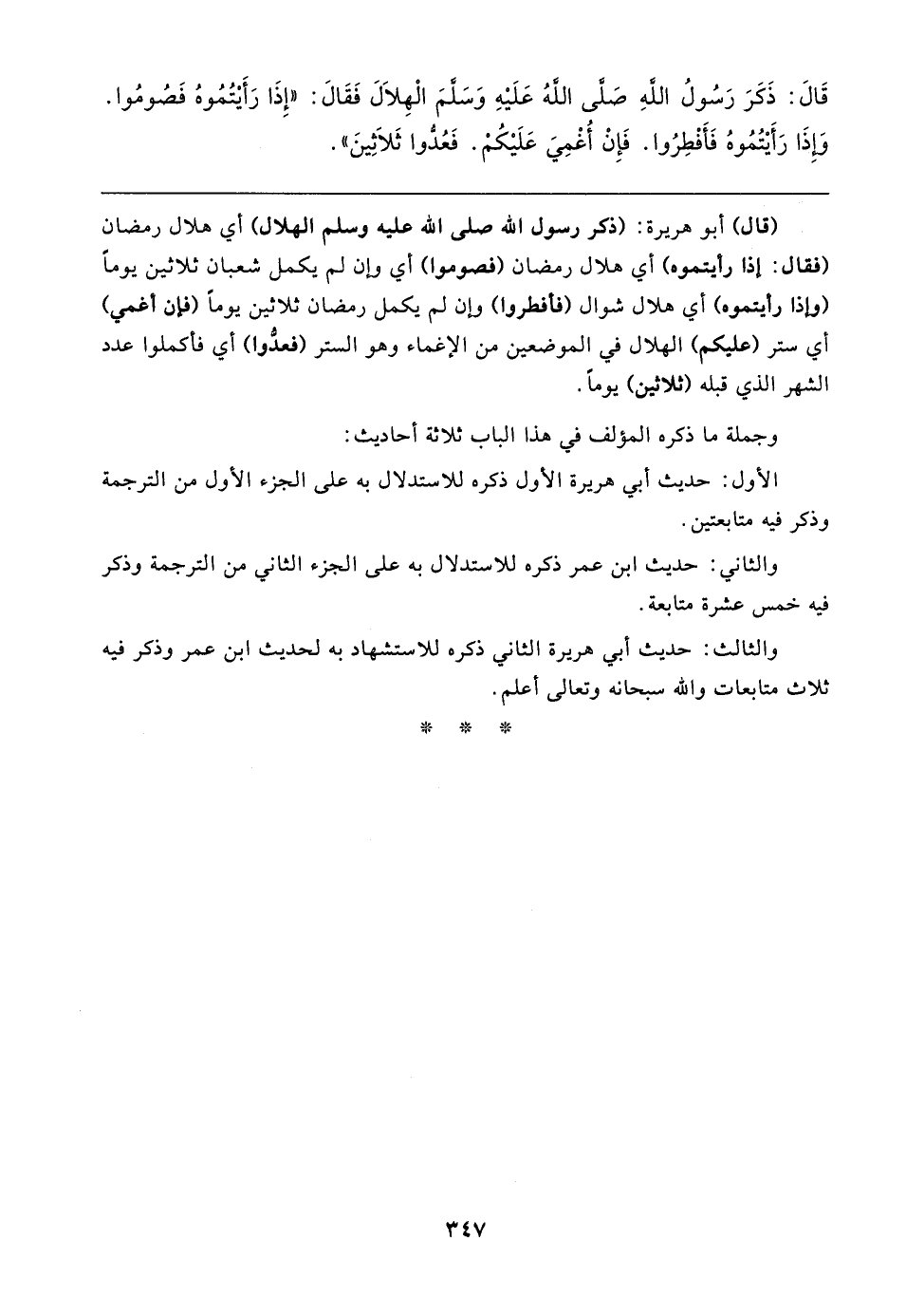 قَال: ذَكَرَ رَسُولُ اللهِ صَلَّى اللهُ عَلَيهِ وَسَلَّمَ الْهِلَال فَقَال: "إِذَا رَأَيتُمُوهُ فَصُومُوا. وَإِذَا رَأَيتُمُوهُ فَأَفْطِرُوا. فَإِنْ أُغْمِيَ عَلَيكُمْ. فَعُدُّوا ثَلَاثِينَ"