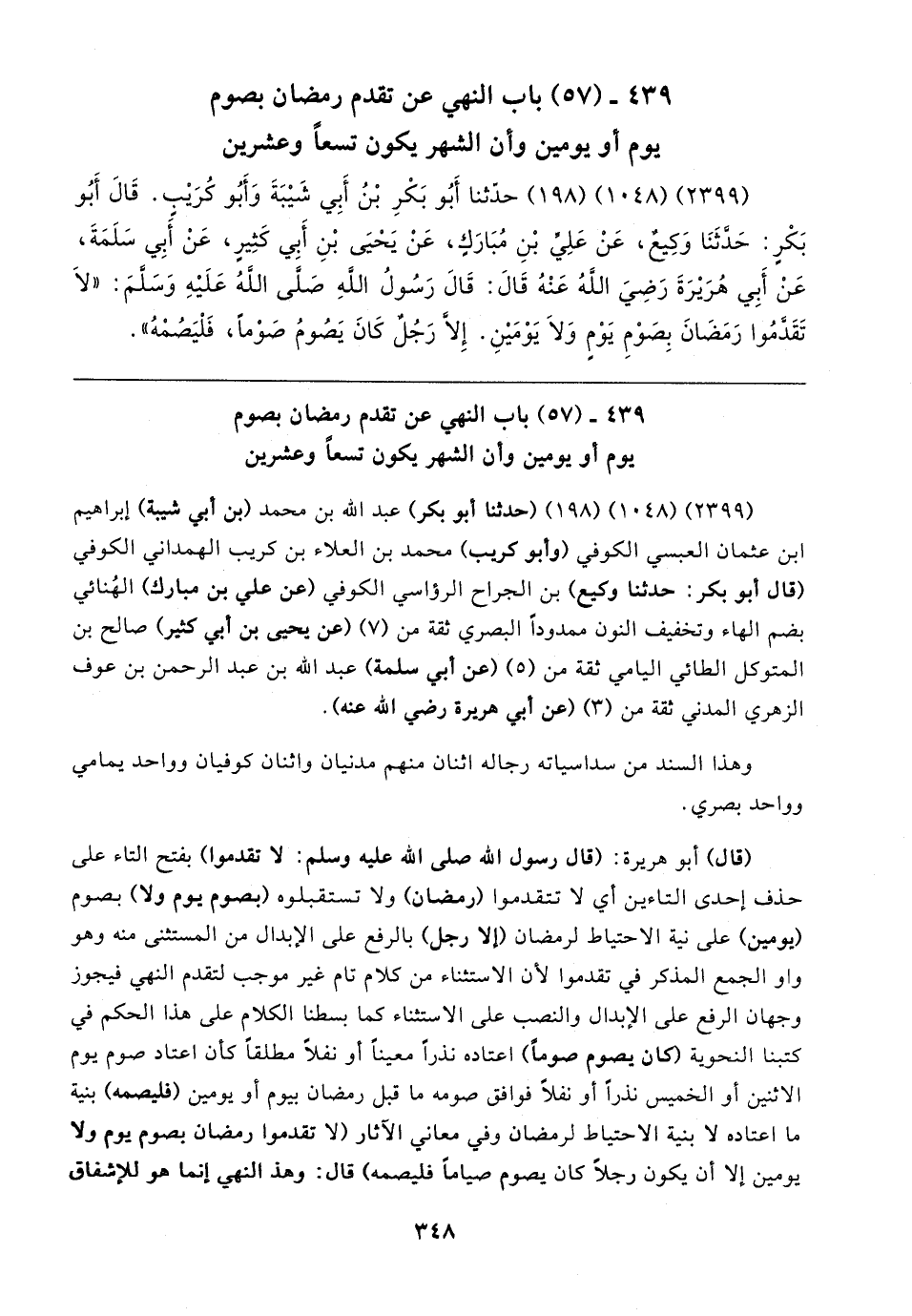 (٢٣٩٩) (١٠٤٨) (١٩٨) حدَّثنا أَبُو بَكْرٍ بْنُ أَبِي شَيبَةَ وَأَبُو كُرَيبٍ. قَال أَبُو بَكْرٍ: حَدَّثَنَا وَكِيعٌ، عَنْ عَلِى بْنِ مُبَارَكٍ، عَنْ يَحْيَى بْنِ أَبِي كَثِيرٍ، عَنْ أَبِي سَلَمَةَ، عَنْ أَبِي هُرَيرَةَ رَضِيَ اللهُ عَنْهُ قَال: قَال رَسُولُ اللهِ صَلَّى اللهُ عَلَيهِ وَسَلَّمَ: "لَا تَقَدُّمُوا رَمَضَانَ بِصَوْمِ يَوْمٍ وَلَا يَوْمَينِ. إلا رَجُل كَانَ يَصُومُ صَوْمًا، فَلْيَصُمْهُ"