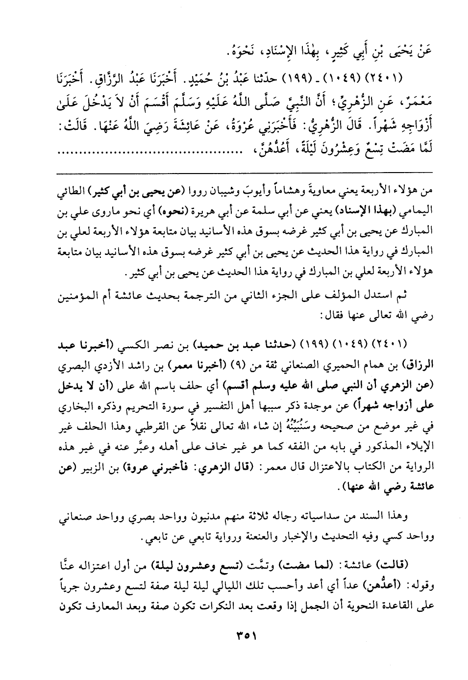 (٢٤٠١) (١٠٤٩) - (١٩٩) حدَّثنا عَبْدُ بْنُ حُمَيدٍ. أَخْبَرَنَا عَبْدُ الرَّزاقِ. أَخْبَرَنَا مَعْمَر، عَنِ الزُّهْرِيِّ؛ أَنَّ النَّبِيَّ صَلَّى اللهُ عَلَيهِ وَسَلَّمَ أَقْسَمَ أَنْ لَا يَدْخُلَ عَلَى أَزْوَاجِهِ شَهْرًا. قَال الزُّهْرِيُّ: فَأَخْبَرَنِي عُرْوَةُ، عَنْ عَائِشَةَ رَضِيَ اللهُ عَنْهَا. قَالتْ: لَمَّا مَضَتْ تِسْعٌ وَعِشْرُونَ لَيلَةً، أَعُدُّهُنَّ،