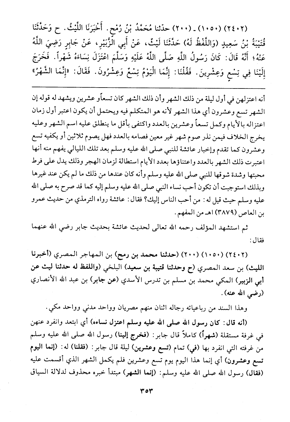 (٢٤٠٢) (١٠٥٠) - (٢٠٠) حدَّثنا مُحَمَّدُ بْنُ رُمْحٍ. أخْبَرَنَا اللَّيثُ. ح وَحدَّثَنَا قُتَيبَةُ بْنُ سَعِيدٍ (وَاللَّفْظُ لَهُ) حَدَّثَنَا لَيثٌ، عَنْ أَبِي الزُّبَيرِ، عَنْ جَابِرِ رَضِيَ اللهُ عَنْهُ؛ أَنهُ قَال: كَانَ رَسُولُ اللهِ صَلَّى اللهُ عَلَيهِ وَسَلَّمَ اعْتَزَلَ نِسَاءَهُ شَهْرًا. فَخَرَجَ إِلَينَا في تِسْعٍ وَعِشْرِينَ. فَقُلْنَا: إِنَّمَا الْيَوْمُ تِسْعٌ وَعِشْرُونَ. فَقَال: "إِنَّمَا الشَهْرُ"