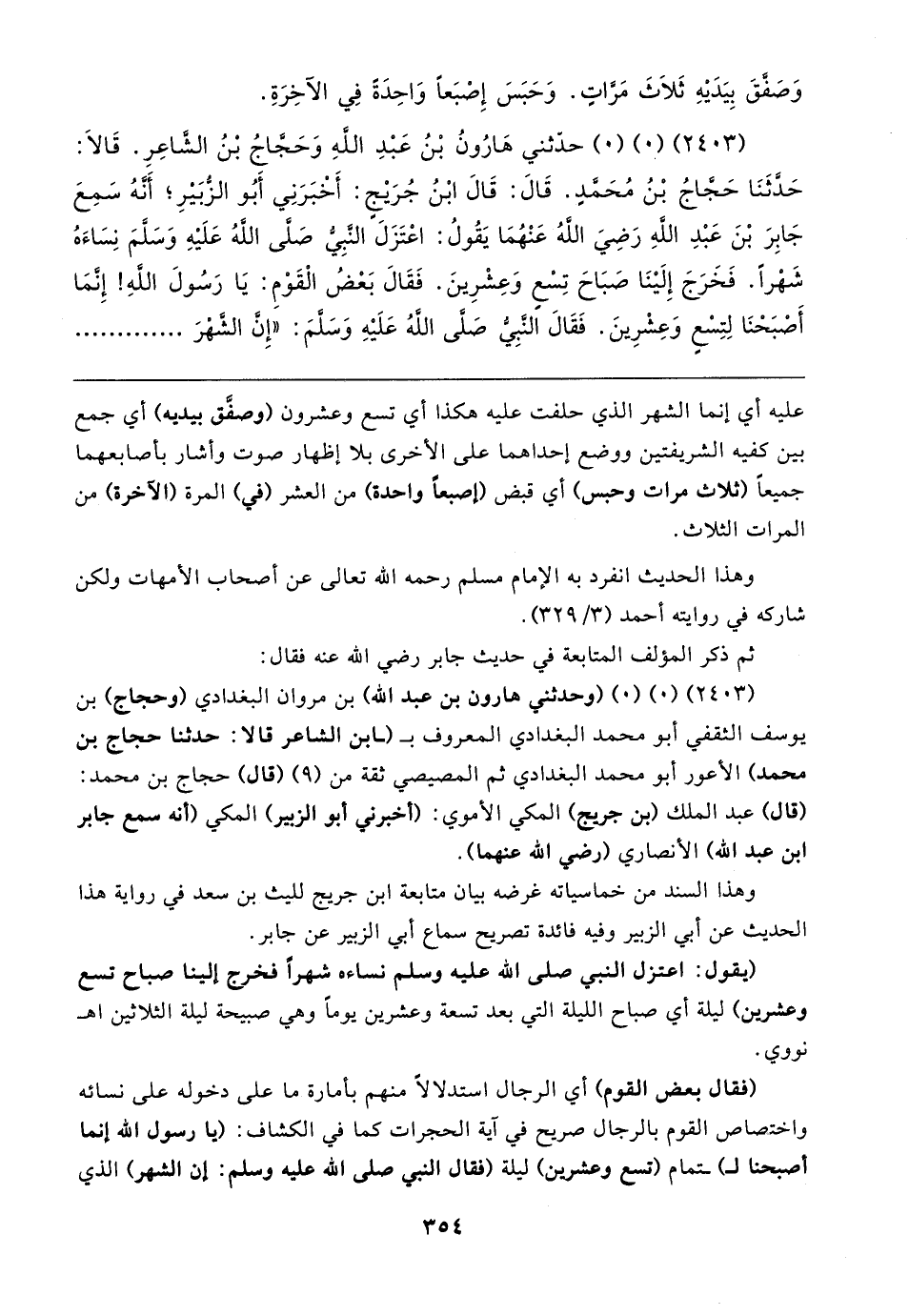 (٢٤٠٣) (٠) (٠) حدَّثني هَارُونُ بْنُ عَبْدِ اللهِ وَحَجَّاجُ بْنُ الشاعِرِ. قَالا: حَدَّثَنَا حَجَّاجُ بْنُ مُحَمَّدٍ. قَال: قَال ابْنُ جُرَيجٍ: أَخْبَرَنِي أَبُو الزبَيرِ؛ أَنهُ سَمِعَ جَابِرَ بْنَ عَبْدِ اللهِ رَضِيَ اللهُ عَنْهُمَا يَقُولُ: اعْتَزَلَ النَّبِيّ صَلَّى اللهُ عَلَيهِ وَسَلَّمَ نِسَاءَهُ شَهْرًا. فَخَرَجَ إِلَينَا صَبَاحَ تِسْعٍ وَعِشْرِينَ. فَقَال بَعْضُ الْقَوْمِ: يَا رَسُولَ اللهِ! إِنمَا أَصْبَحْنَا لِتِسْعٍ وَعِشْرِينَ. فَقَال النَّبِيّ صَلَّى اللهُ عَلَيهِ وَسَلَّمَ: "إِن الشهْرَ