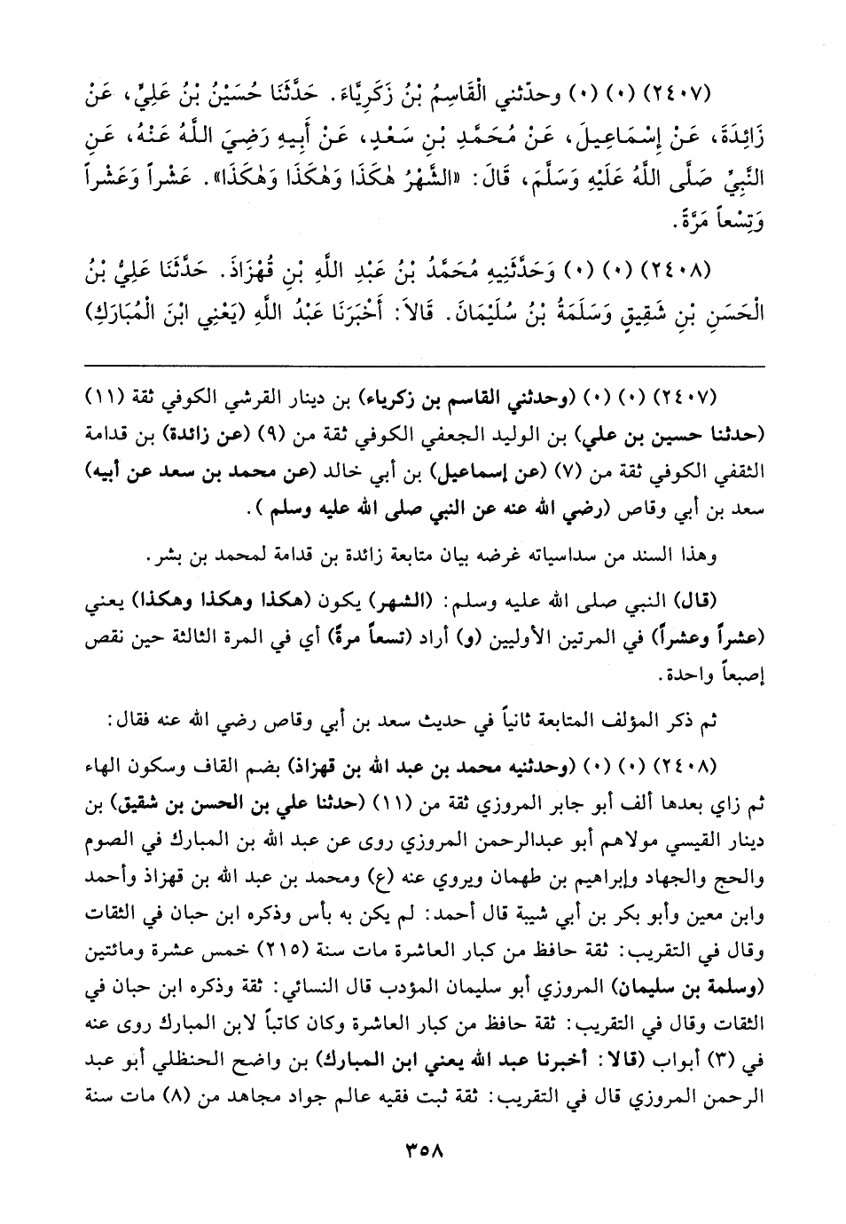 (٢٤٠٧) (٠) (٠) (وحدثني القاسم بن زكرياء) بن دينار القرشي الكوفي ثقة (١١) (حَدَّثَنَا حسين بن علي) بن الوليد الجعفي الكوفي ثقة من (٩) (عن زائدة) بن قدامة الثقفي الكوفي ثقة من (٧) (عن إسماعيل) بن أبي خالد (عن محمد بن سعد عن أبيه) سعد بن أبي وقاص (رضي الله عنه عن النبي صلى الله عليه وسلم).