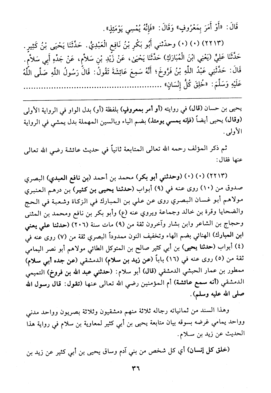 (٢٢١٣) (٠) (٠) (وحدثني أبو بكر) محمد بن أحمد (بن نافع العبدي) البصري صدوق من (١٠) روى عنه في (٩) أبواب (حدثنا يحيى بن كثير) بن درهم العنبري مولاهم أبو غسان البصري روى عن علي بن المبارك في الزكاة وشعبة في الحج والضحايا وقرة بن خالد وجماعة ويروي عنه (ع) وأبو بكر بن نافع ومحمد بن المثنى وحجاج بن الشاعر وابن بشار وآخرون ثقة من (٩) مات سنة (٢٠٦) (حدثنا علي يعني ابن المبارك) الهنائي بضم الهاء وتخفيف النون ممدودًا البصري ثقة من (٧) روى عنه في (٤) أبواب (حدثنا يحيى) بن أبي كثير صالح بن المتوكل الطائي مولاهم أبو نصر اليمامي ثقة من (٥) روى عنه في (١٦) بابا (عن زيد بن سلام) الدمشقي (عن جده أبي سلام) ممطور بن عمار الحبشي الدمشقي (قال) أبو سلام: (حدثني عبد الله بن فروخ) التميمي الدمشقي (أنه سمع عائشة) أم المؤمنين رضي الله تعالى عنها (تقول: قال رسول الله صلى الله عليه وسلم).