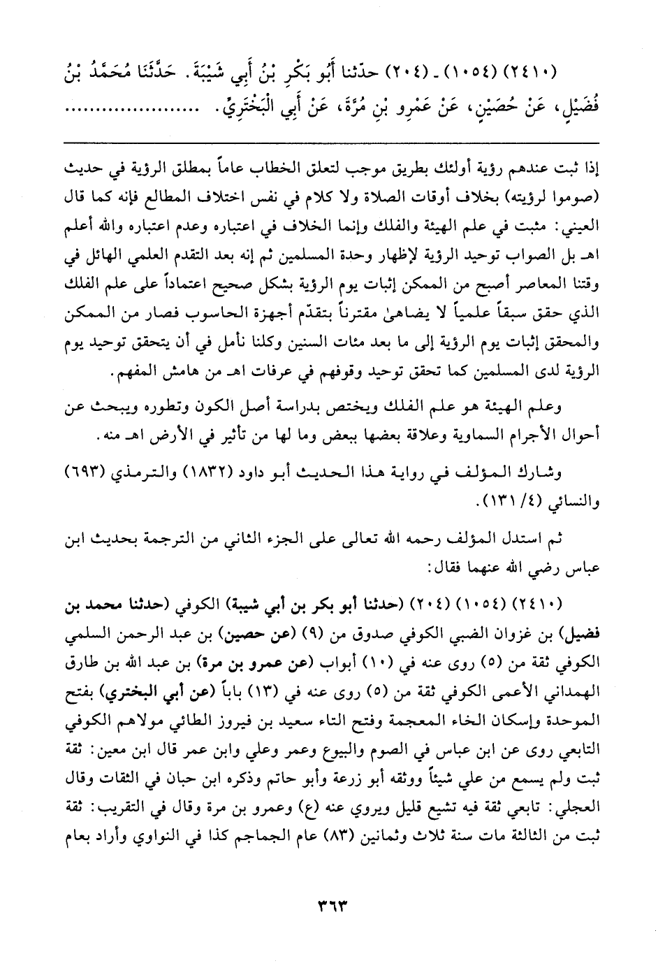 (٢٤١٠) (١٠٥٤) (٢٠٤) (حَدَّثَنَا أبو بكر بن أبي شيبة) الكوفي (حَدَّثَنَا محمد بن فضيل) بن غزوان الضبي الكوفي صدوق من (٩) (عن حصين) بن عبد الرحمن السلمي الكوفي ثقة من (٥) روى عنه في (١٥) أبواب (عن عمرو بن مرة) بن عبد الله بن طارق الهمداني الأعمى الكوفي ثقة من (٥) روى عنه في (١٣) بابا (عن أبي البختري) بفتح الموحدة وإسكان الخاء المعجمة وفتح التاء سعيد بن فيروز الطائي مولاهم الكوفي التابعي روى عن ابن عباس في الصوم والبيوع وعمر وعلي وابن عمر قال ابن معين: ثقة ثبت ولم يسمع من علي شيئًا ووثقه أبو زرعة وأبو حاتم وذكره ابن حبان في الثقات وقال العجلي: تابعي ثقة فيه تشيع قليل ويروي عنه (ع) وعمرو بن مرة وقال في التقريب: ثقة ثبت من الثالثة مات سنة ثلاث وثمانين (٨٣) عام الجماجم كذا في النواوي وأراد بعام